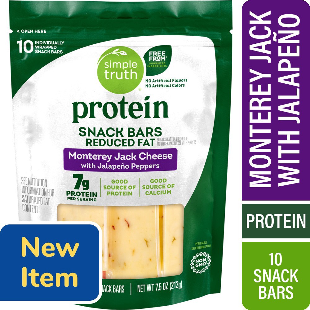 Simple Truth® Protein Reduced Fatˆ Monterey Jack Cheese with Jalapeño Peppers Snack Bars offer bite-sized goodness. Each pack delivers a good source of protein as well as a good source of calcium. The…