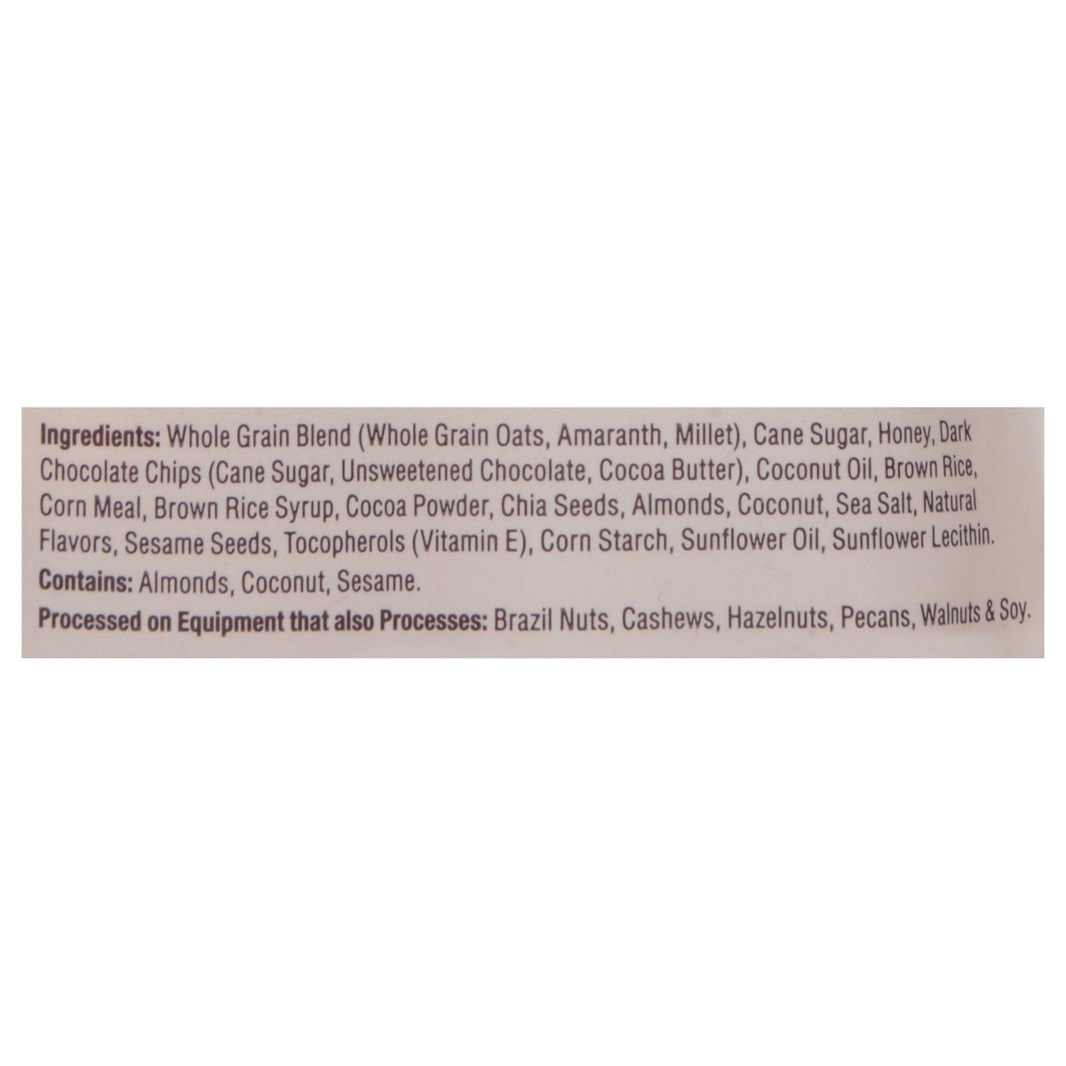 Whole Grain Blend (Whole Grain Oats, Amaranth, Millet), Cane Sugar, Honey, Dark Chocolate Chips (Cane Sugar, Unsweetened Chocolate, Cocoa Butter), Coconut Oil, Brown Rice, Corn Meal, Brown Rice Syrup,…