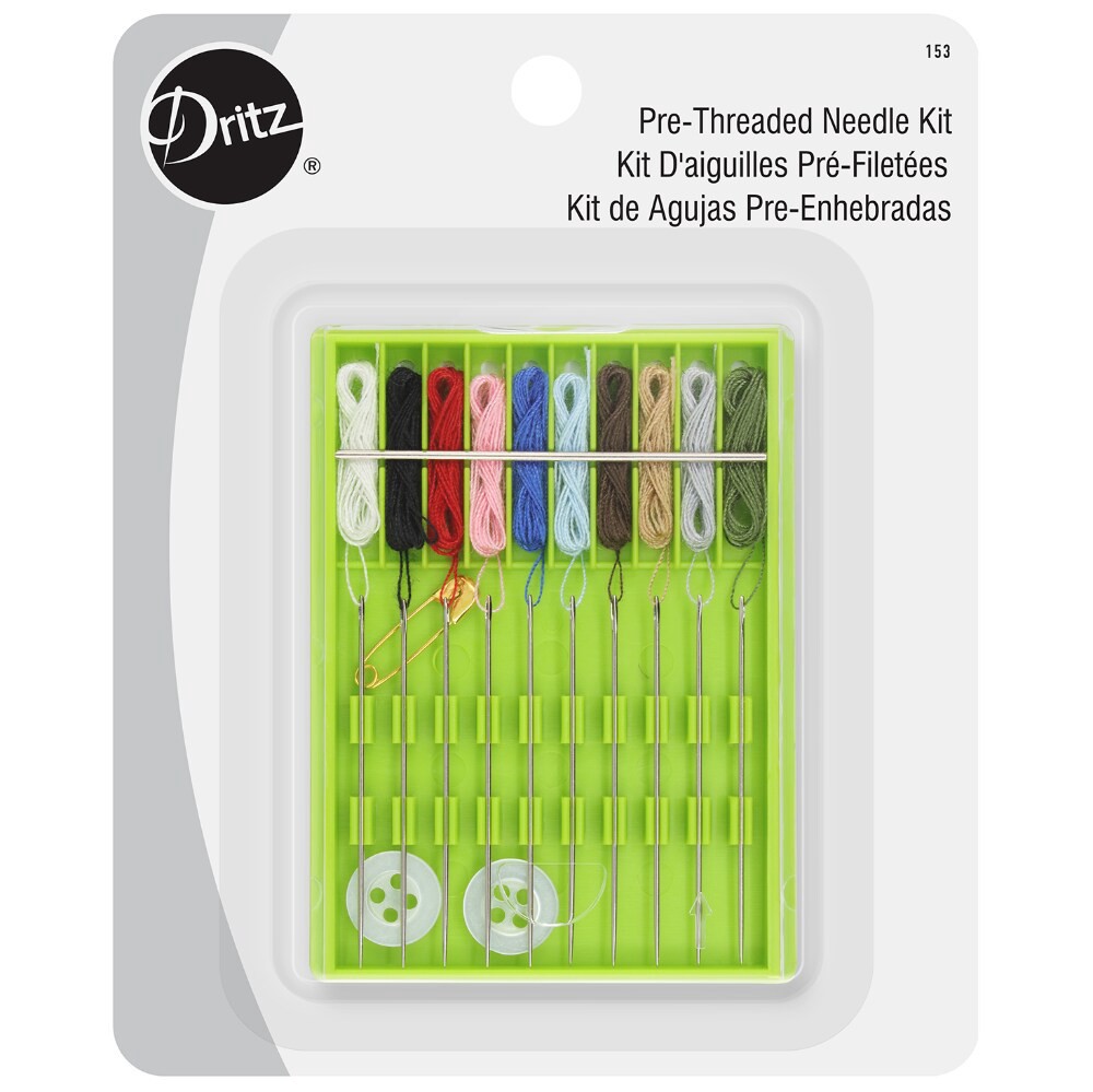 The Dritz Pre-Threaded Needle Kit is perfect for quick repairs and emergency fixes. It contains 2 buttons, 1 Safety Pin and 10 pre-threaded hand needles with white, black, red, pink, brown, tan, roya…