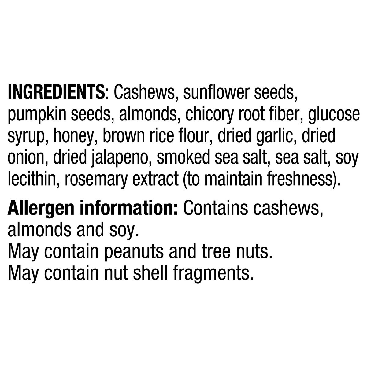 Cashews, Sunflower Seeds, Pumpkin Seeds, Almonds, Chicory Root Fiber, Glucose Syrup, Honey, Brown Rice Flour, Dried Garlic, Dried Onion, Dried Jalapeno, Smoked Sea Salt, Sea Salt, Soy Lecithin, Rosema…