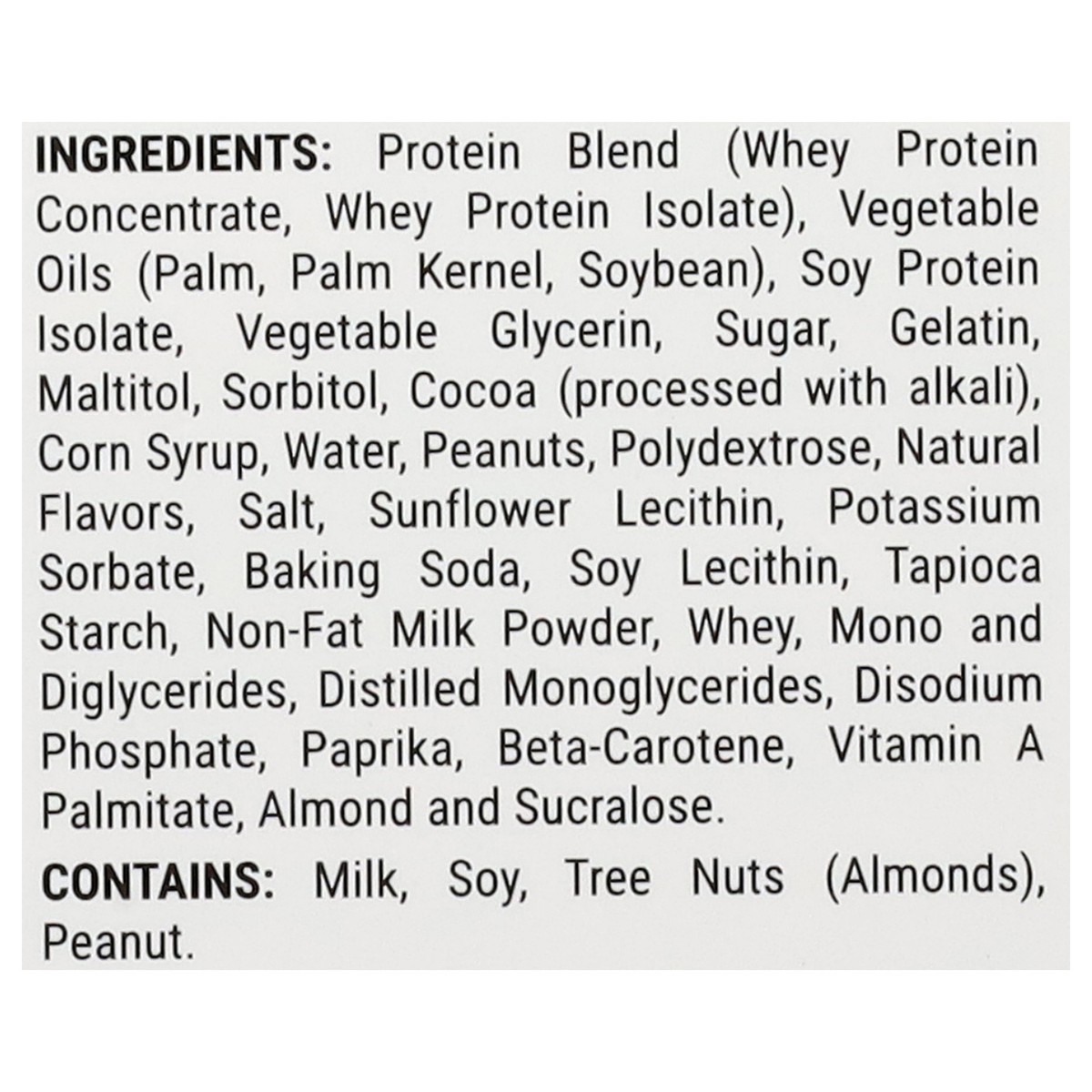 Protein Blend (Whey Protein Concentrate, Whey Protein Isolate), Vegetable Oils (Palm, Palm Kernel, Soybean), Soy Protein Isolate, Vegetable Glycerin, Sugar, Gelatin, Maltitol, Sorbitol, Cocoa (Process…