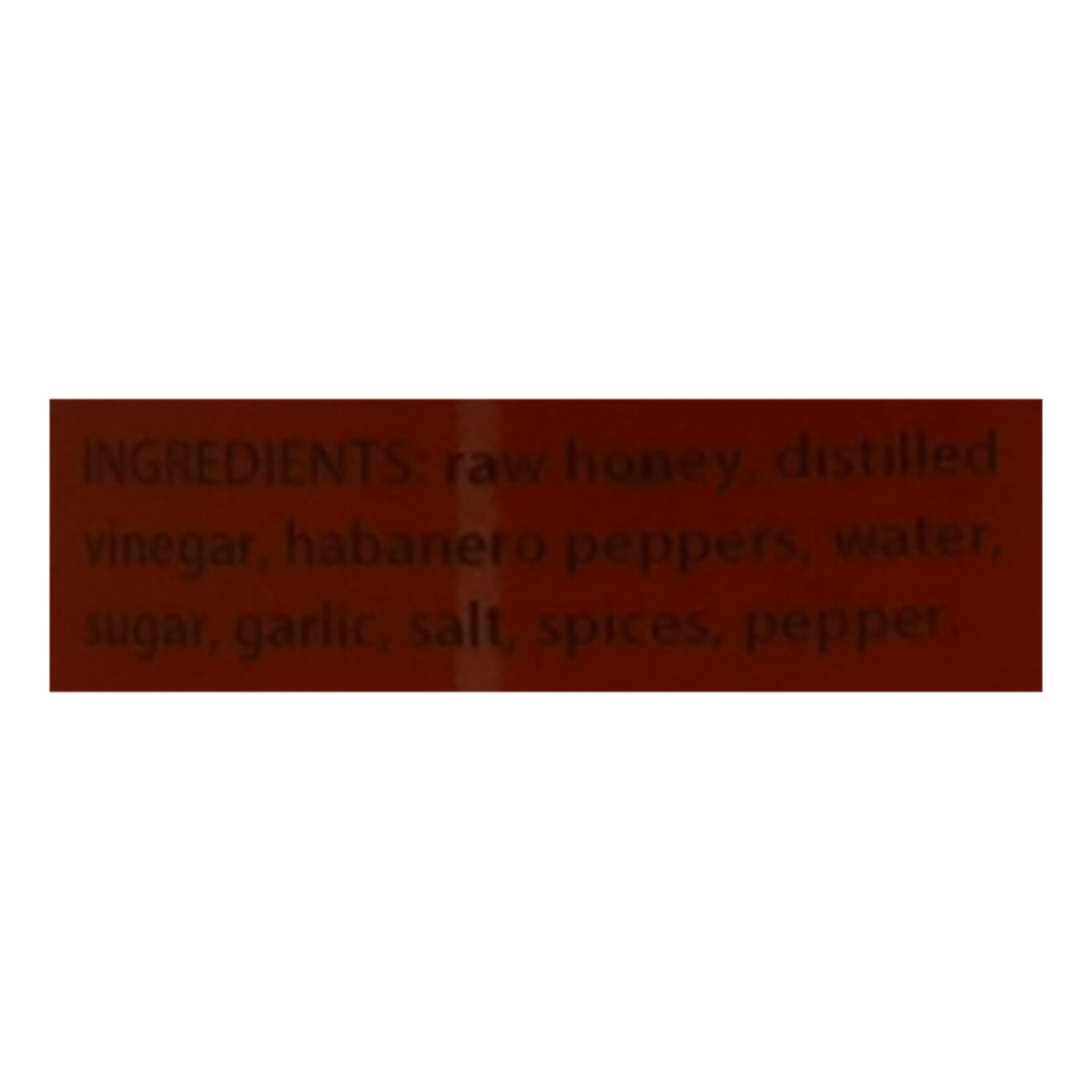 Raw Honey, Distilled Vinegar, Habanero Peppers, Water, Sugar, Garlic, Salt, Spices, Pepper.