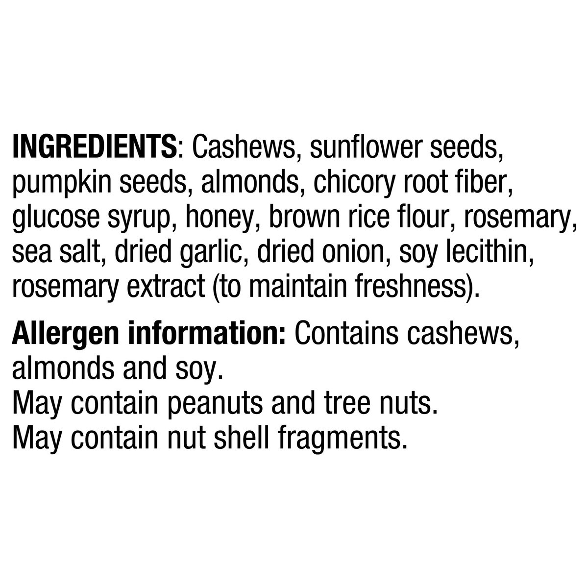 Cashews, Sunflower Seeds, Pumpkin Seeds, Almonds, Chicory Root Fiber, Glucose Syrup, Honey, Brown Rice Flour, Rosemary, Sea Salt, Dried Garlic, Dried Onion, Soy Lecithin, Rosemary Extract (to Maintain…