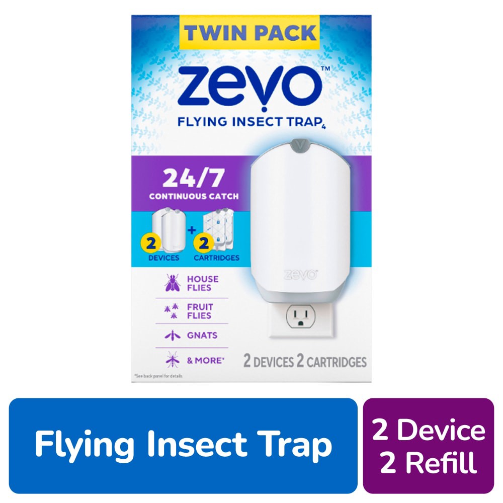 Zevo Flying Insect Indoor Fly Trap: Easy, Mess-Free Solution - Light Trap Catches & Kills House Flies, Fruit Flies, Gnats, & More (2 Plug in Devices & 2 Refill Cartridges)