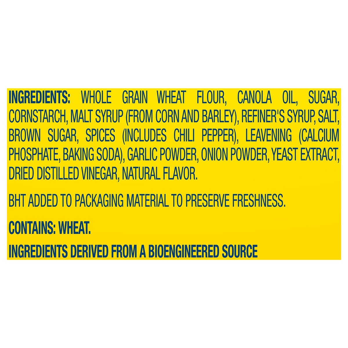 Whole Grain Wheat Flour, Canola Oil, Sugar, Cornstarch, Malt Syrup (from Corn and Barley), Refiner''s Syrup, Salt, Brown Sugar, Spices (Includes Chili Pepper), Leavening (Calcium Phosphate, Baking Sod…