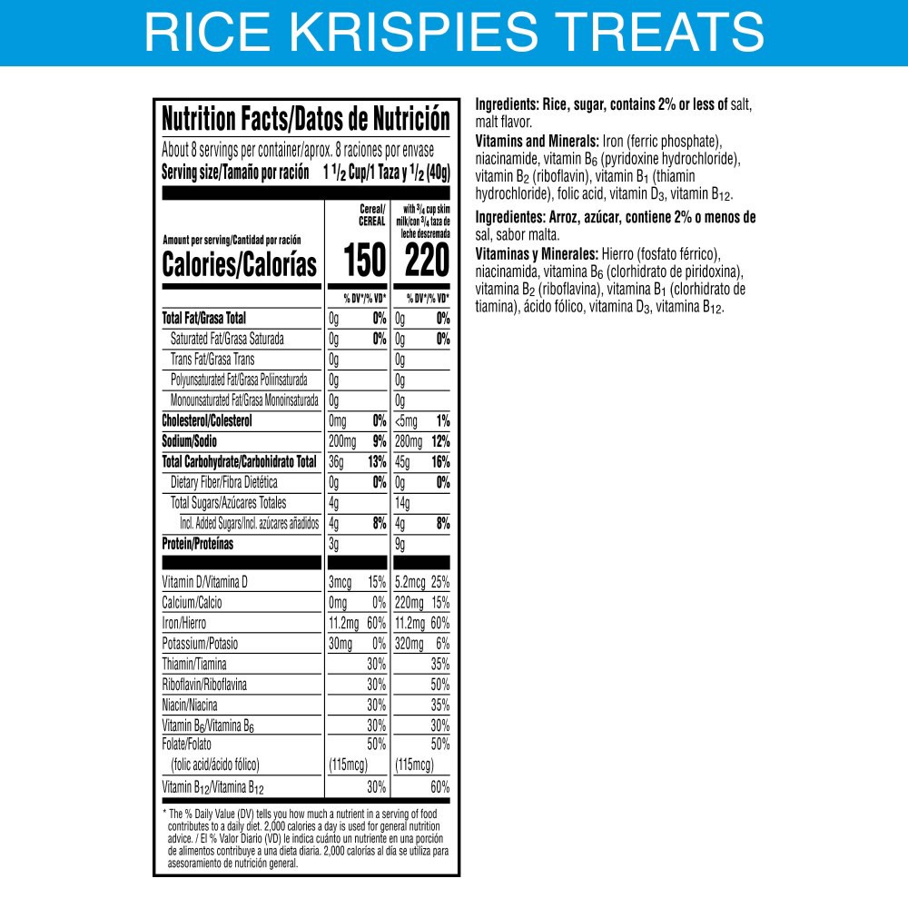 Rice, Sugar, Contains 2% or Less of Salt, Malt Flavor, Vitamins and Minerals: Iron (Ferric Phosphate), Niacinamide, Vitamin B6 (Pyridoxine Hydrochloride), Vitamin B2 (Riboflavin), Vitamin B1 (Thiamin …
