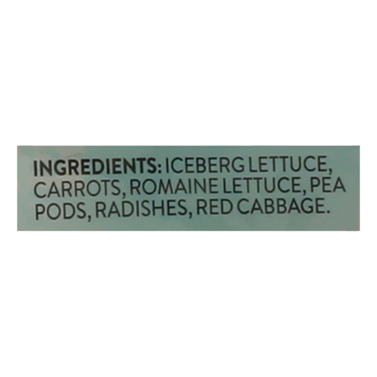 Iceberg Lettuce, Carrots, Romaine Lettuce, Pea Pods, Radishes, Red Cabbage.