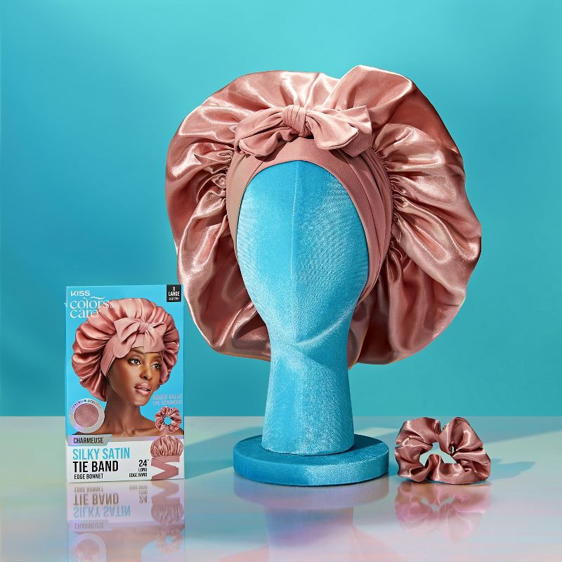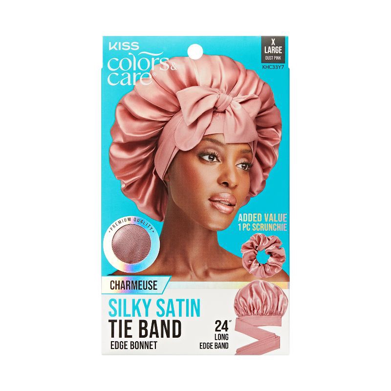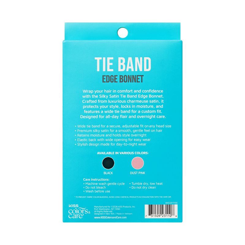 Wrap your hair in comfort and confidence with the KISS Colors & Care Silky Satin Tie Band Edge Bonnet. Premium charmeuse satin locks in moisture, protects styles, and reduces friction for smooth, friz…
