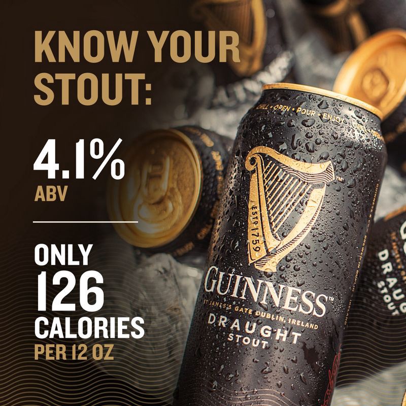 - Guinness Draught Stout is an iconic beer that features our revolutionary nitro widget that delivers a rich, smooth draft head in the comfort of your home, every time. 4.2% alcohol