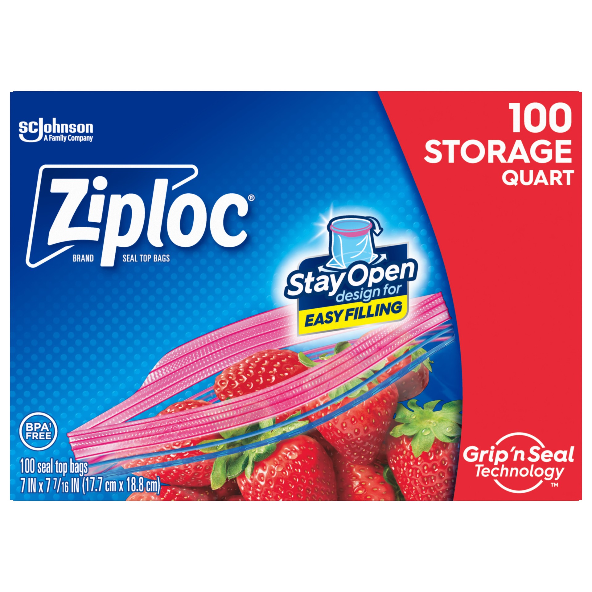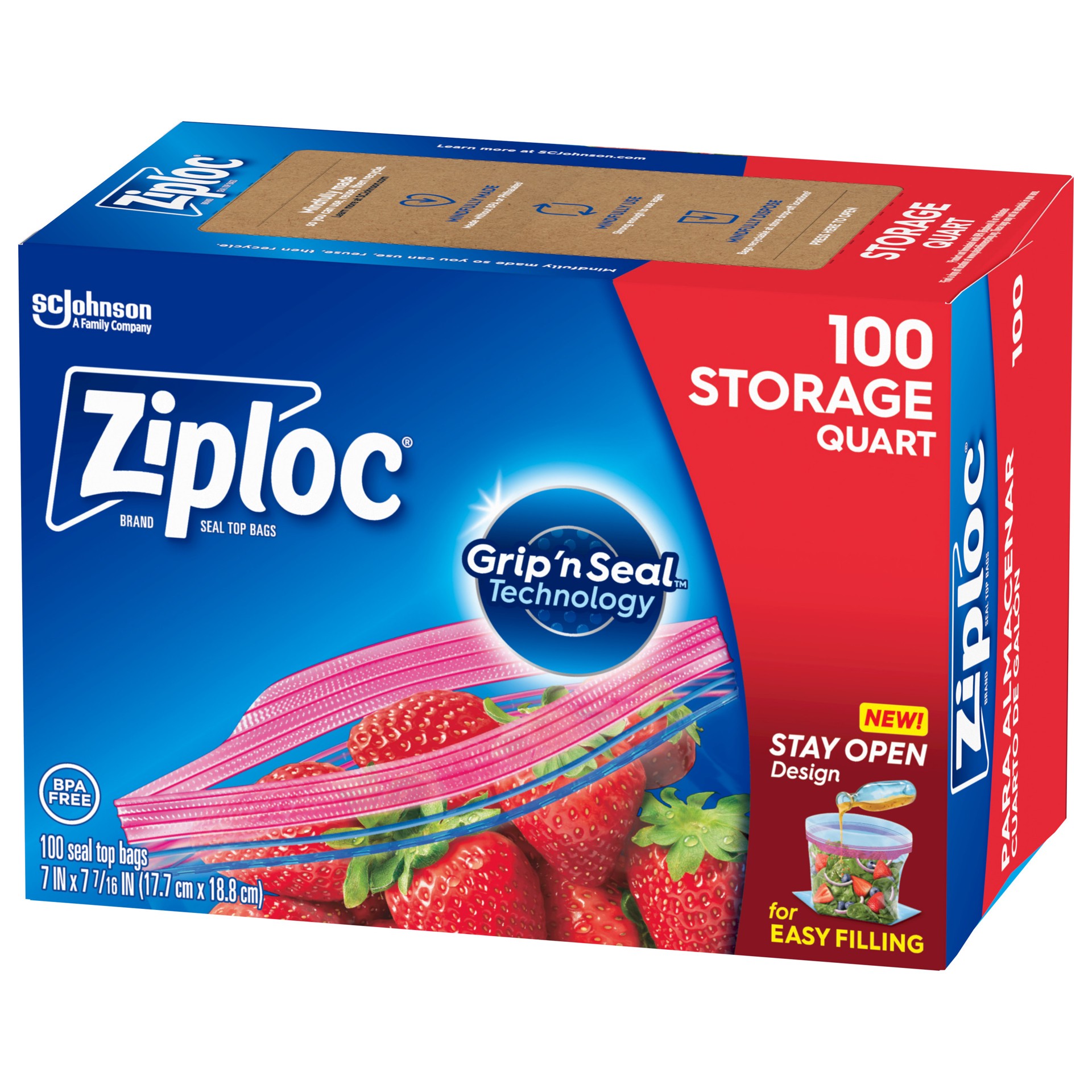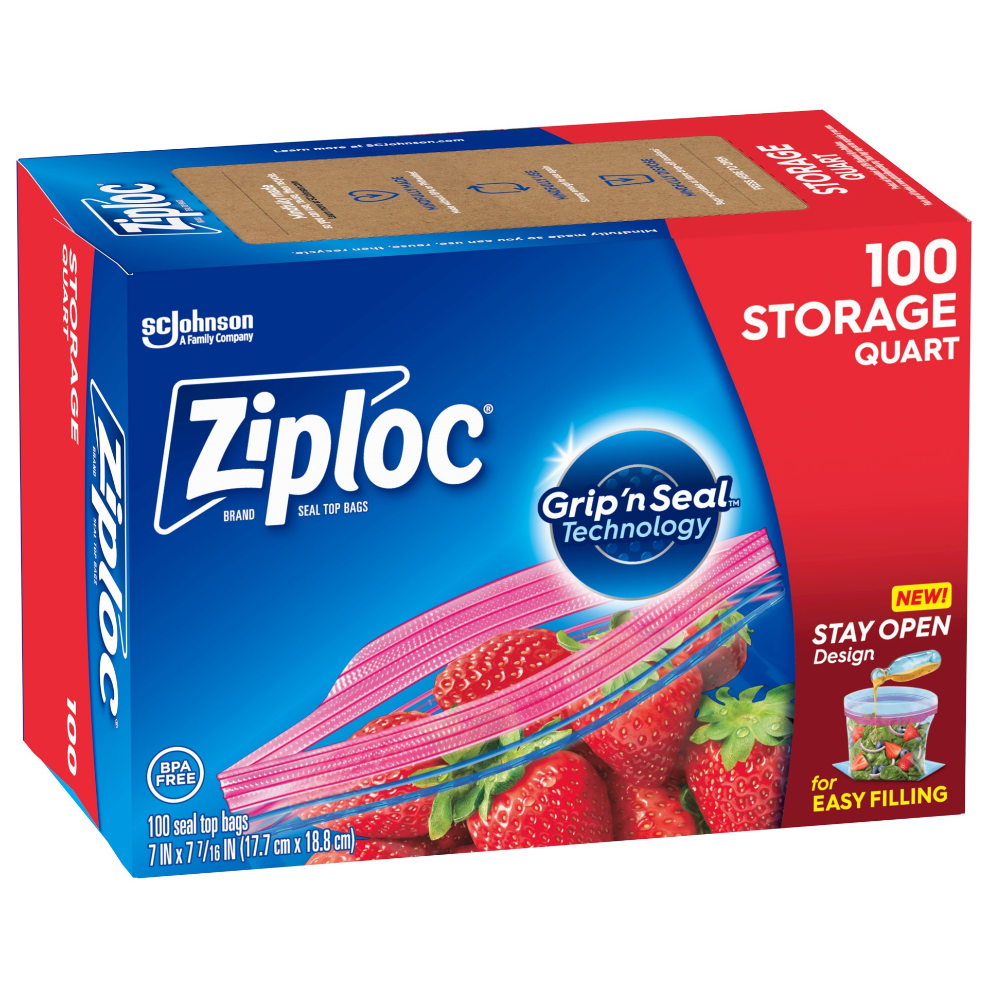 Ziploc Quart Storage Bags, Stay Open Design, Easy to Fill, 100 count
