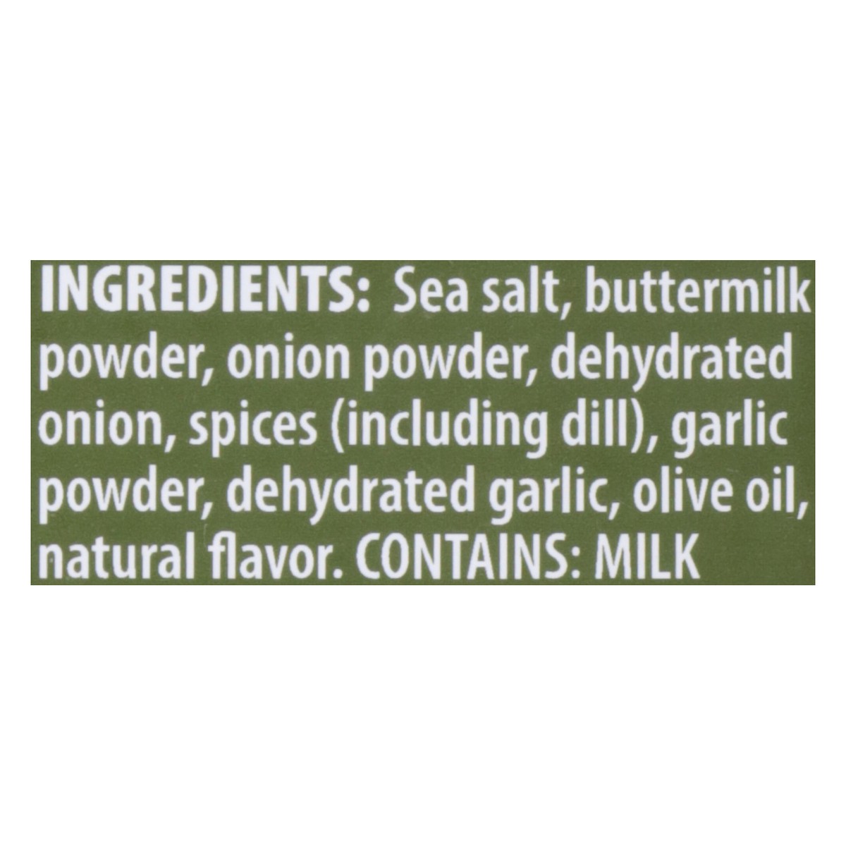 Sea Salt, Buttermilk Powder, Onion Powder, Dehydrated Onion, Spices (Including Dill), Garlic Powder, Dehydrated Garlic, Olive Oil, Natural Flavor.