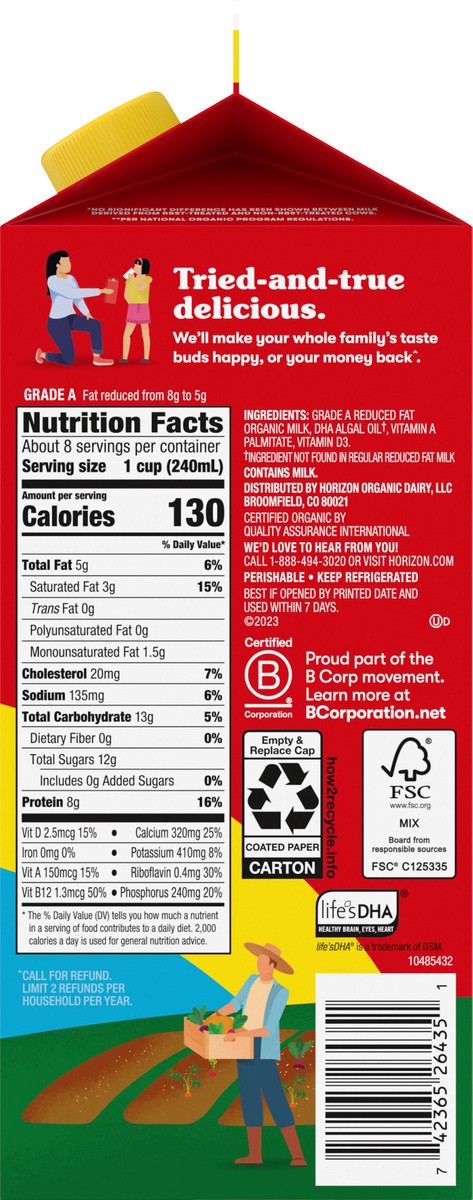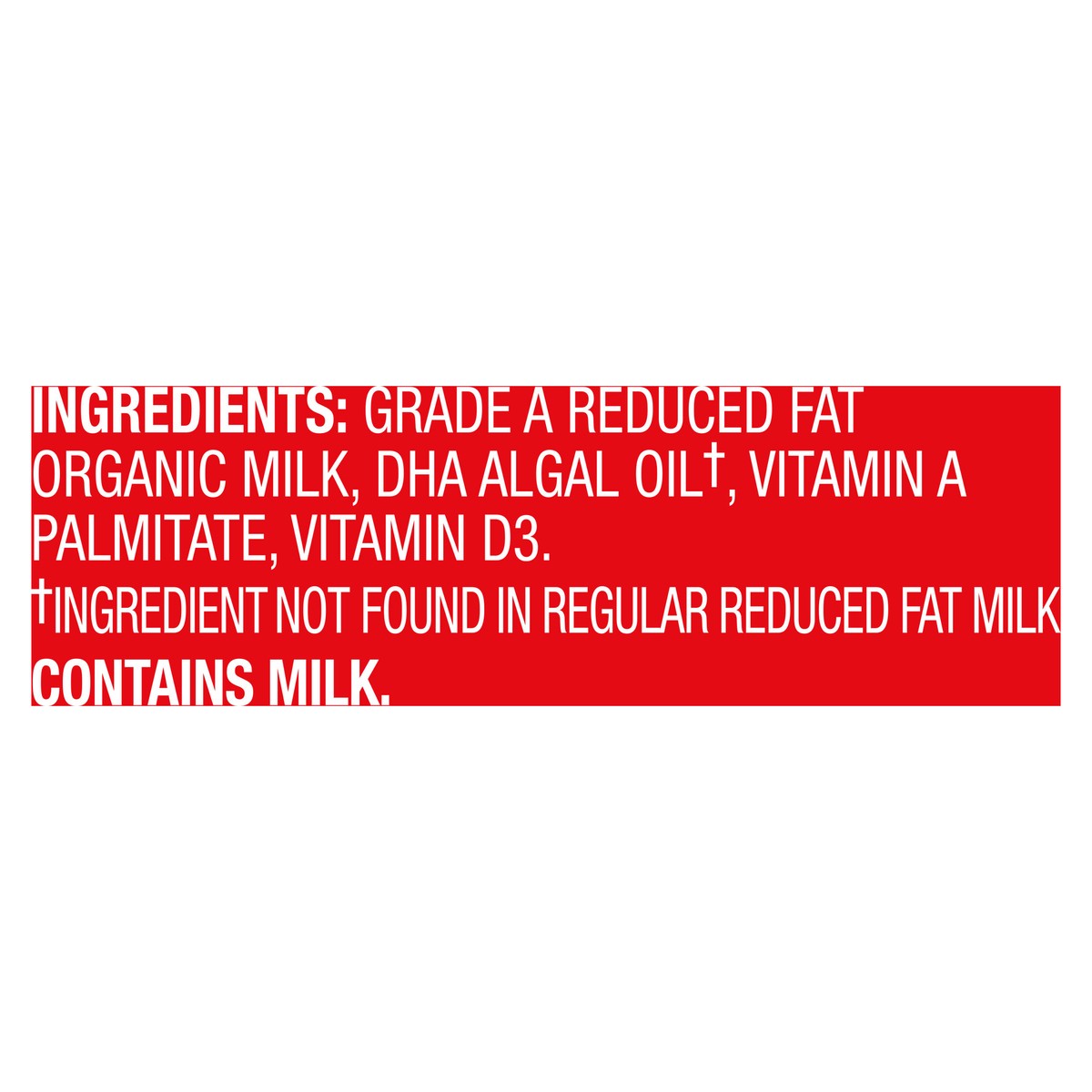 GRADE A REDUCED FAT ORGANIC MILK, DHA ALGAL OIL†, VITAMIN A PALMITATE, VITAMIN D3. †INGREDIENT NOT FOUND IN REGULAR REDUCED FAT MILK