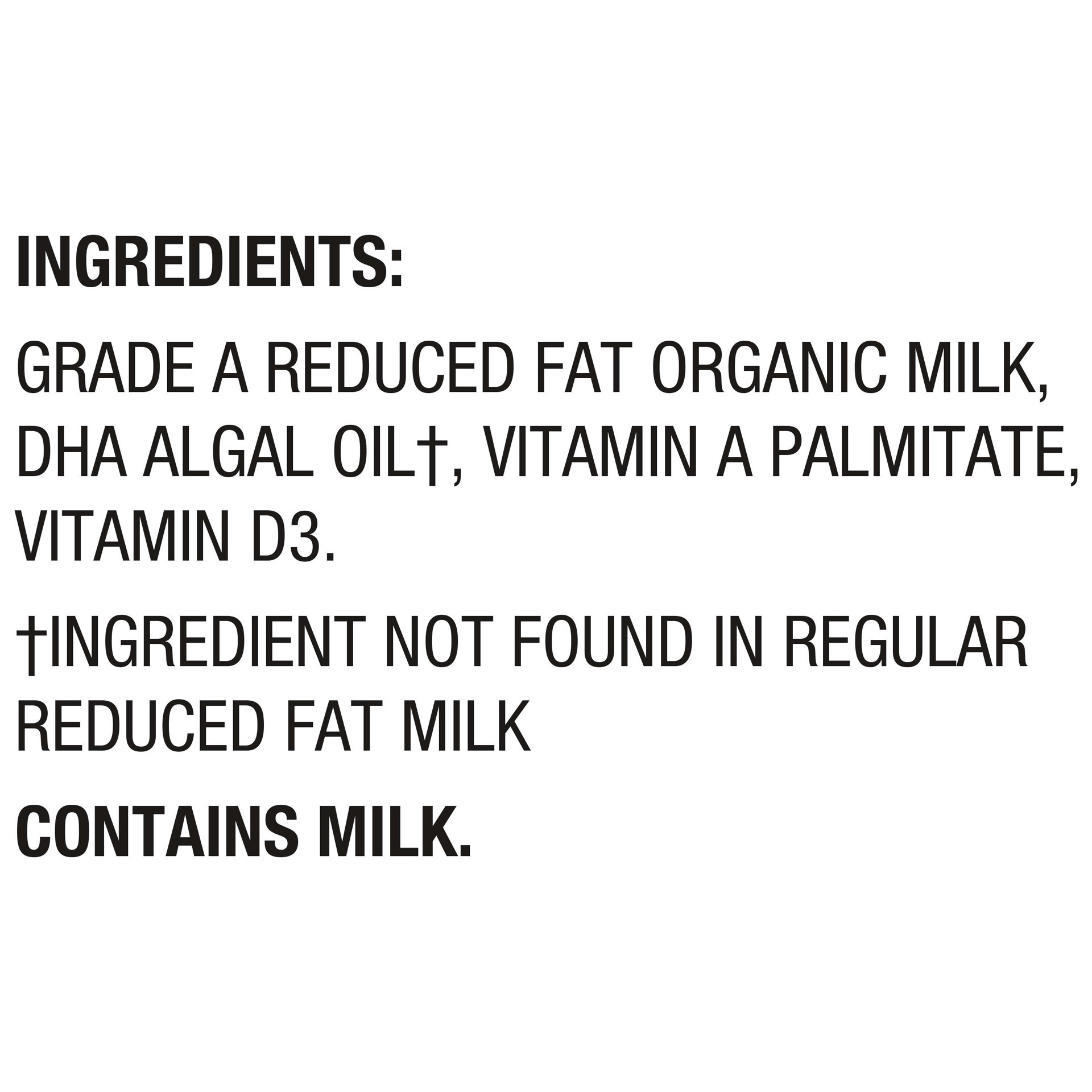 GRADE A REDUCED FAT ORGANIC MILK, DHA ALGAL OIL†, VITAMIN A PALMITATE, VITAMIN D3. †INGREDIENT NOT FOUND IN REGULAR REDUCED FAT MILK