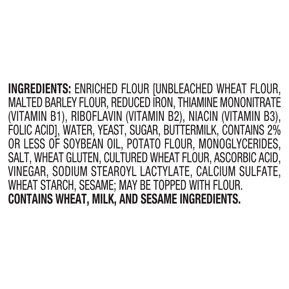 Enriched Flour [Unbleached Wheat Flour, Malted Barley Flour, Reduced Iron, Thiamine Mononitrate (Vitamin B1), Riboflavin (Vitamin B2), Niacin (Vitamin B3), Folic Acid], Water, Yeast, Sugar, Buttermilk…
