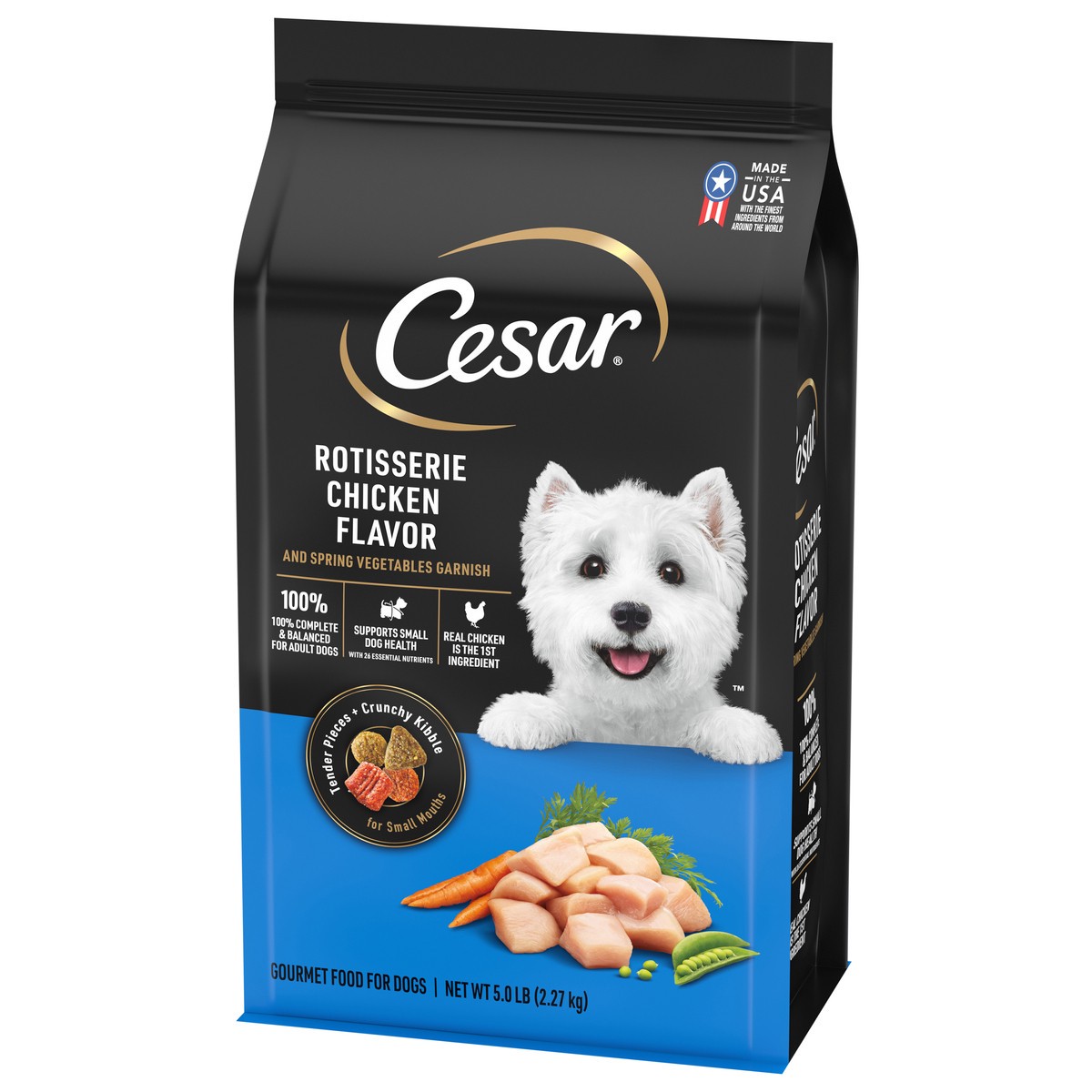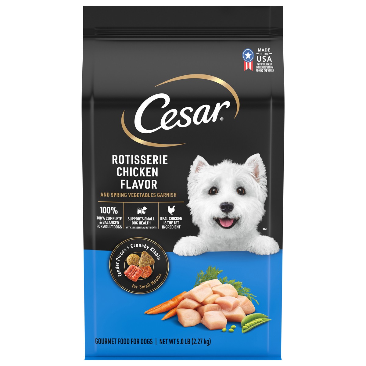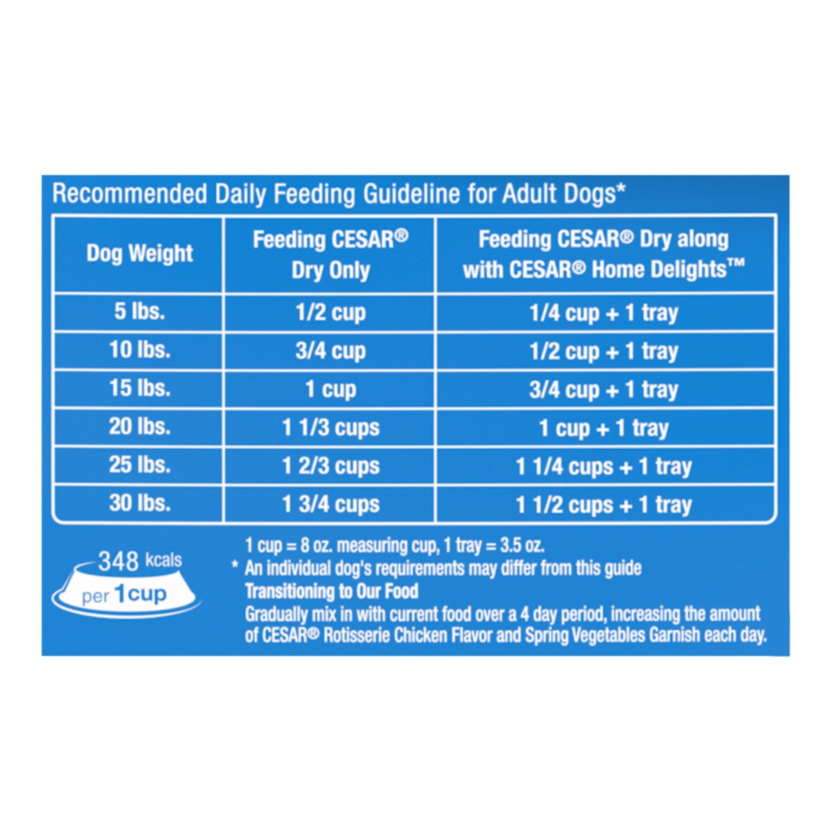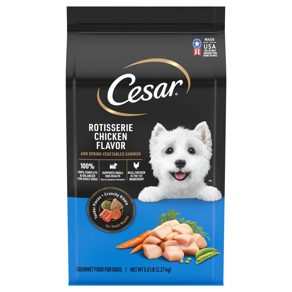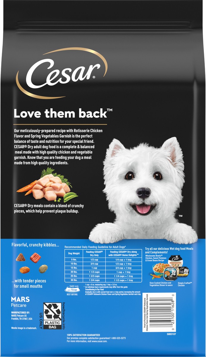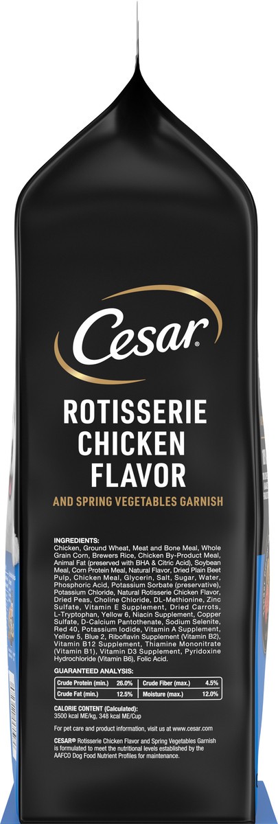 Calorie Content (Calculated): 3500 kcal ME/kg, 348 kcal ME/Cup. Cesar Rotisserie Chicken Flavor and Spring Vegetables Garnish is formulated to meet the nutritional levels established by the AAFCO Dog …