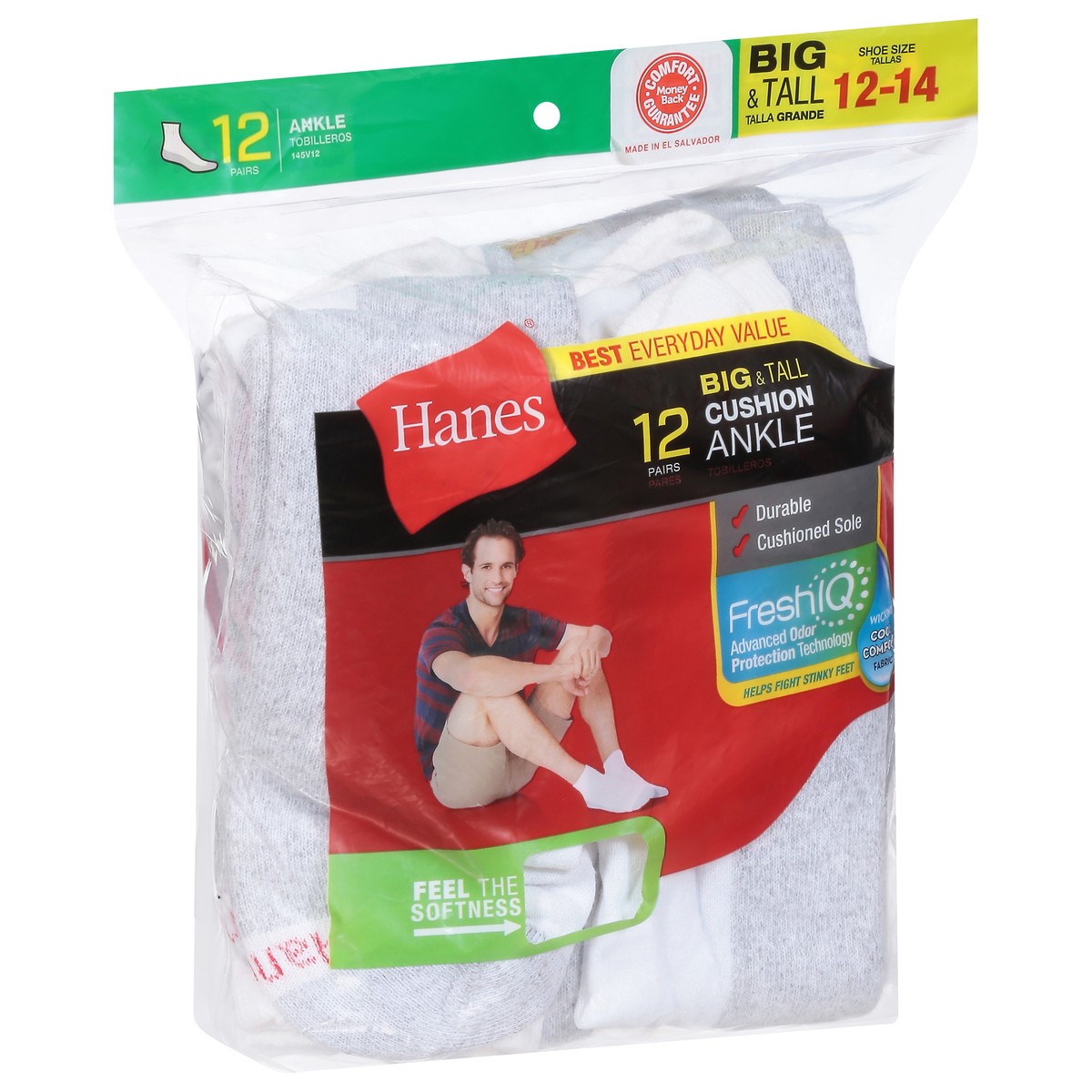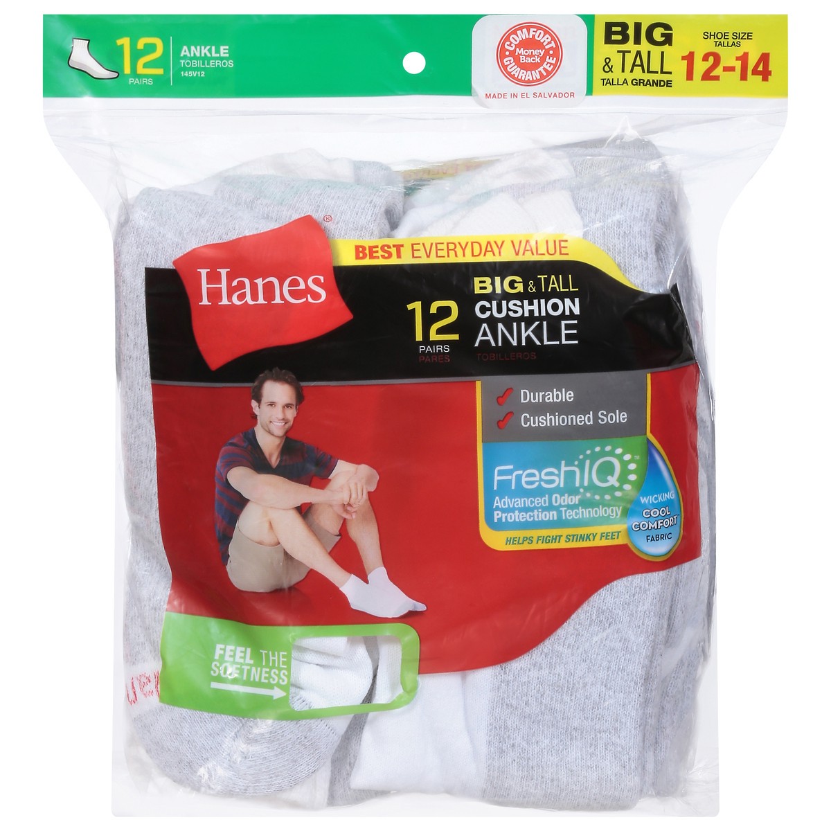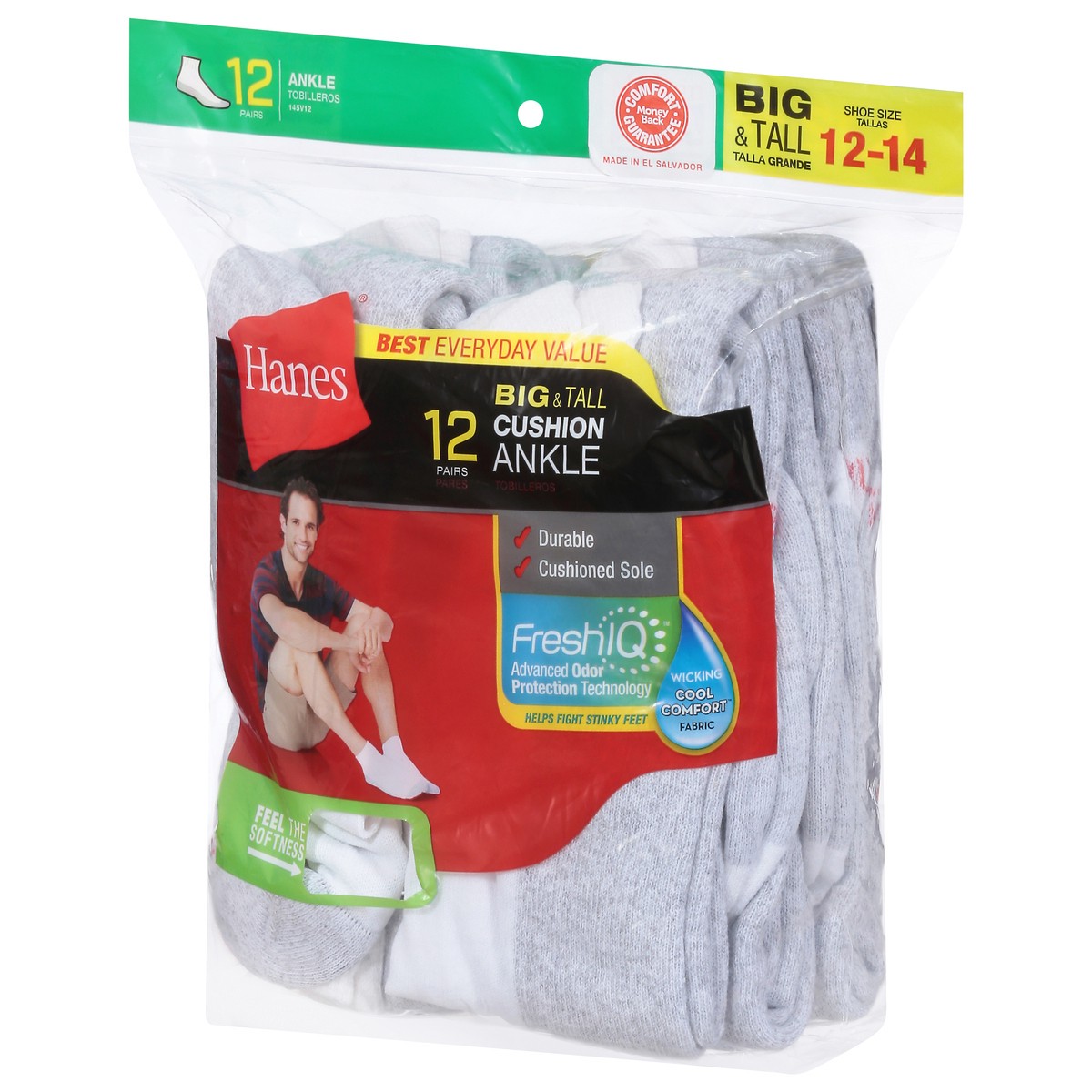 Best everyday value. Big & tall cushion ankle. Durable. Cushioned sole. Fresh IQ. Advanced odor protection technology. Helps fight stinky feet. Feel the soreness. Contents/ 49% cotton. 1% spandex. Dur…