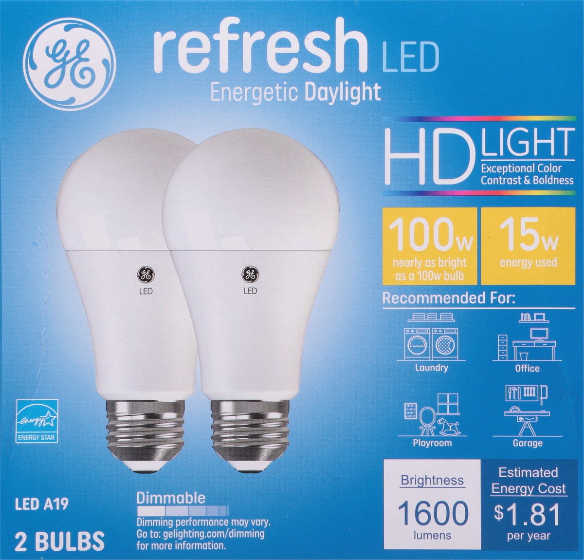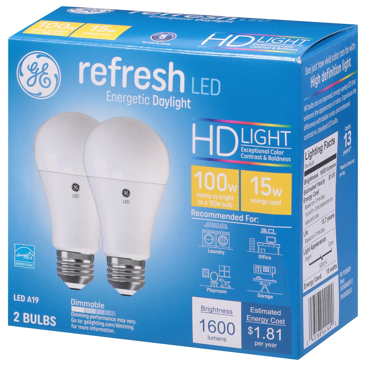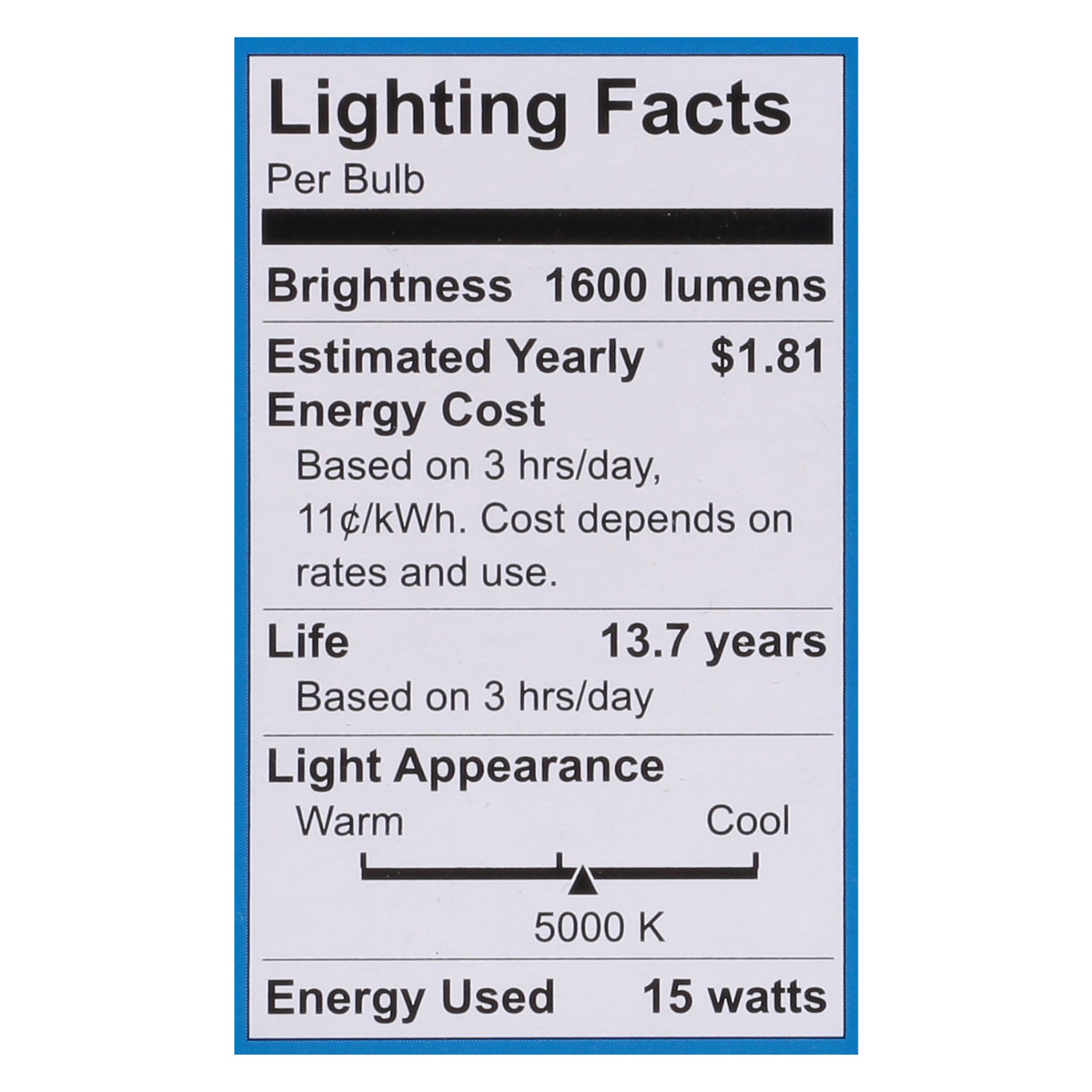 Brightness Quantity: 1600 lumens. Energy Info: $1.81 Based on 3 hrs/day, 11 cents/kWh. Cost depends on rates and use. 15 watts. Package Info: 2. Voltage: . Bulb Info: LED. Is Dimmable. Has Energy Star…