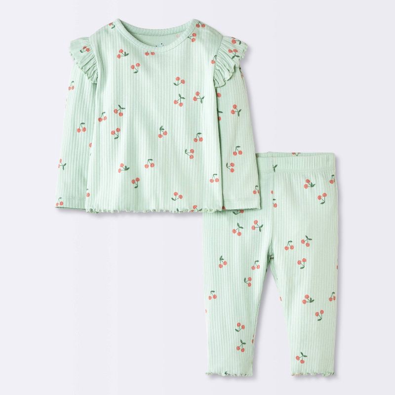 Baby Girls' 2pc Cherry Fruit Ruffle Long Sleeve T-Shirt and Leggings Set - Cloud Island™ Light Mint Green 6-9M