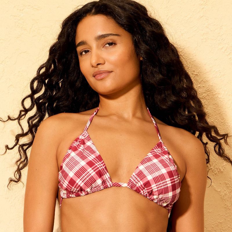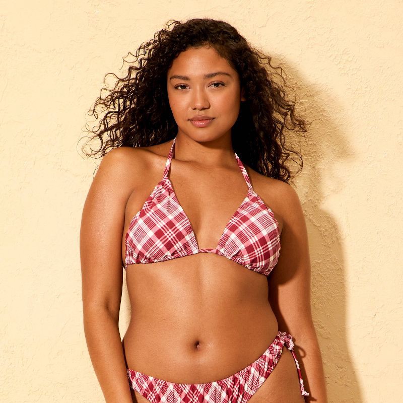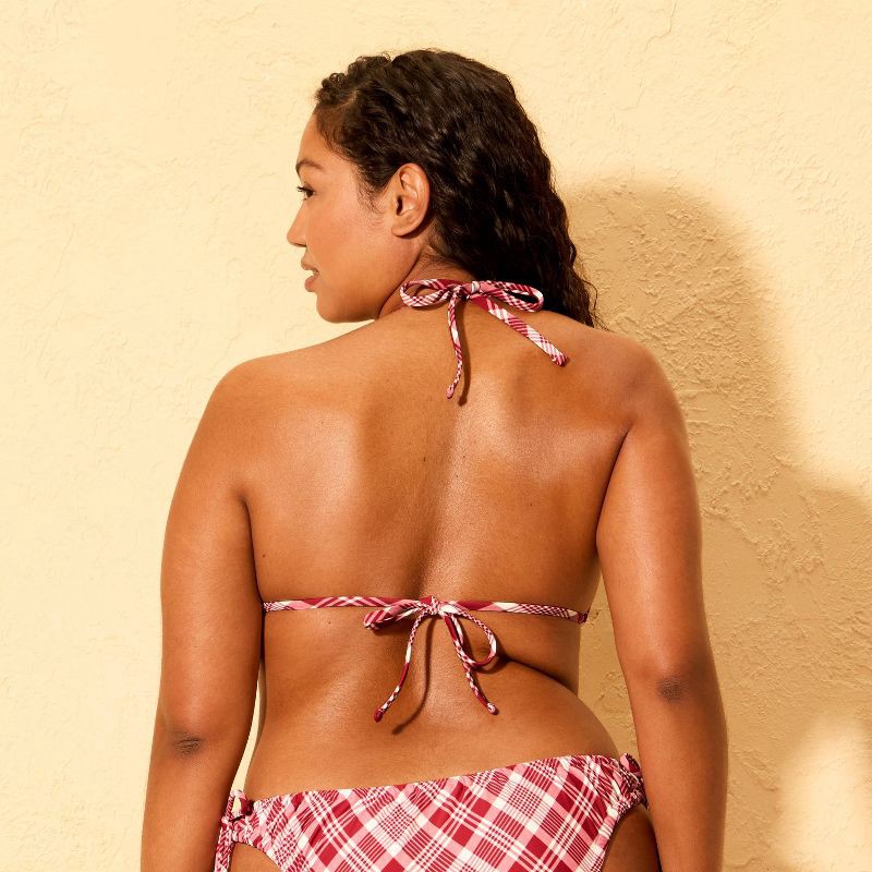 Ruched triangle bikini top from Wild Fable™ features a burgundy-and-white plaid pattern and halter neckline. Made from nylon tricot fabric with spandex and 100% recycled polyester full lining with a f…