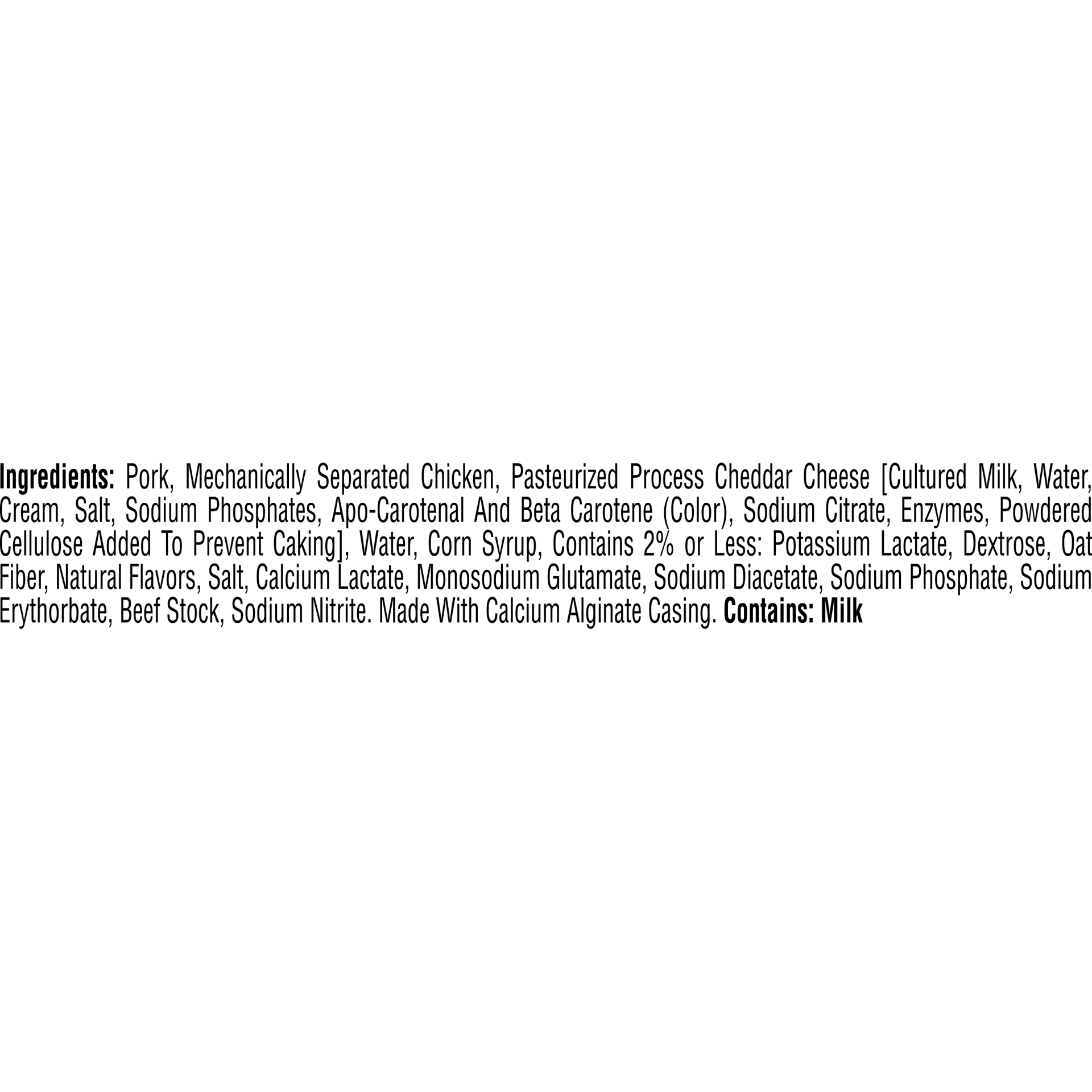 Pork, Mechanically Separated Chicken, Pasteurized Process Cheddar Cheese [Cultured Milk, Water, Cream, Salt, Sodium Phosphates, Apo-Carotenal And Beta Carotene (Color), Sodium Citrate, Enzymes, Powder…