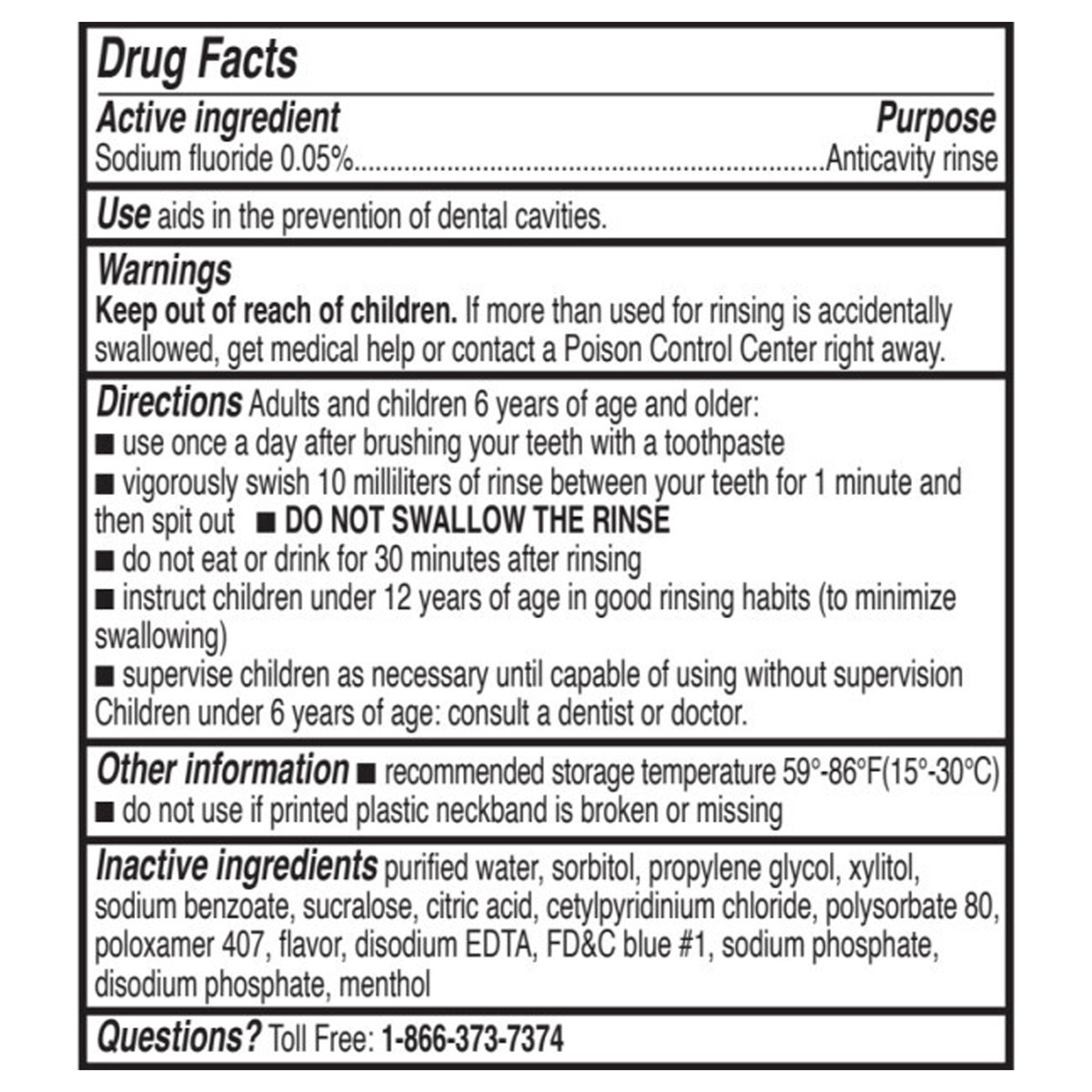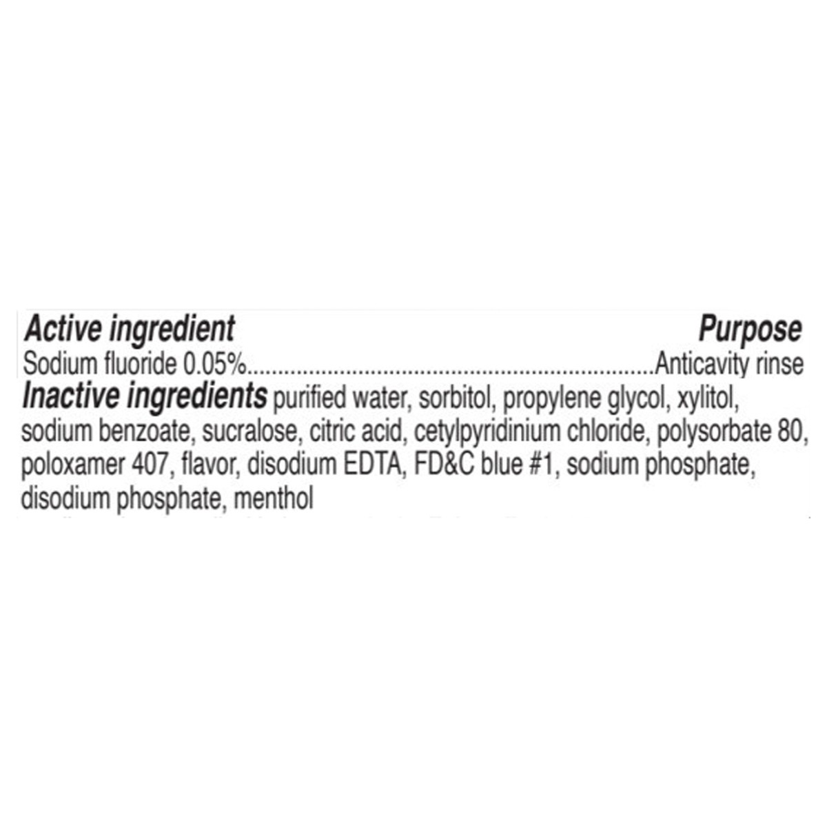 Active Ingredients: Sodium Fluoride (0.05 %), Anticavity Rinse. Inactive Ingredients: Purified Water, Sorbitol, Propylene Glycol, Xylitol, Sodium Benzoate, Sucralose, Citric Acid, Cetylpyridinium Chlo…