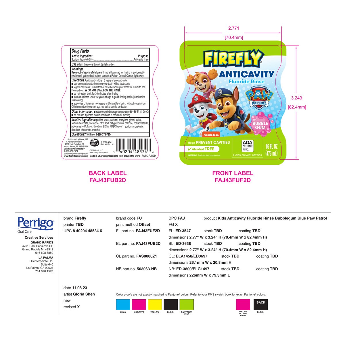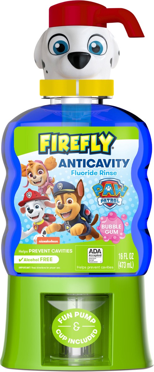 - INCLUDES: 16 ounces of Firefly Paw Patrol Kids Bubble Gum Flavored Anti-cavity Fluoride Rinse