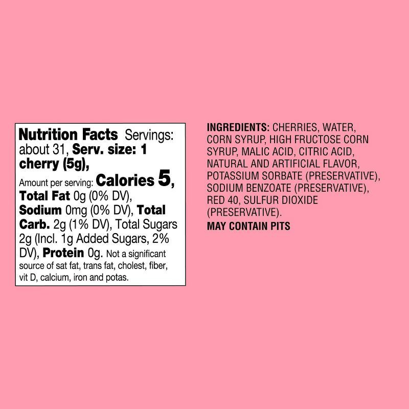 CHERRIES, WATER, CORN SYRUP, HIGH FRUCTOSE CORN SYRUP, MALIC ACID, CITRIC ACID, NATURAL AND ARTIFICIAL FLAVOR, POTASSIUM SORBATE (PRESERVATIVE), SODIUM BENZOATE (PRESERVATIVE), RED 40, SULFUR DIOXIDE …