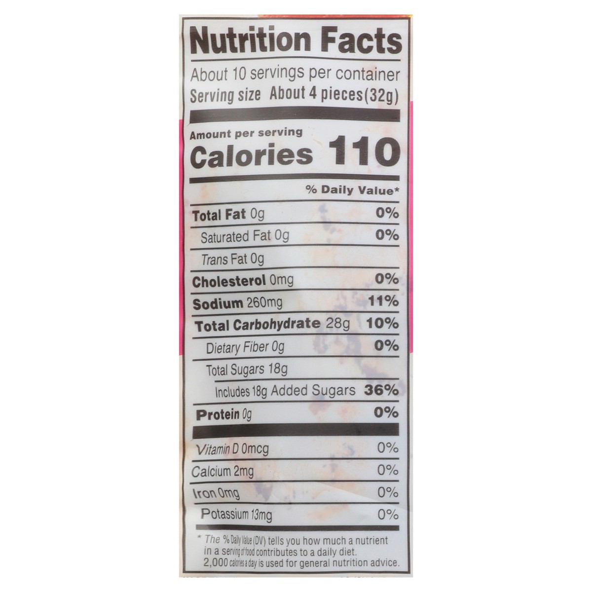 Watermelon Gummy Rings (Sugar, Corn Syrup, Glucose Syrup, Modified Corn Starch, Citric Acid, Fumaric Acid, Tartaric Acid, Malic Acid, Potassium Citrate, Artificial Flavor, Colors [Titanium Dioxide, FD…