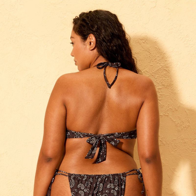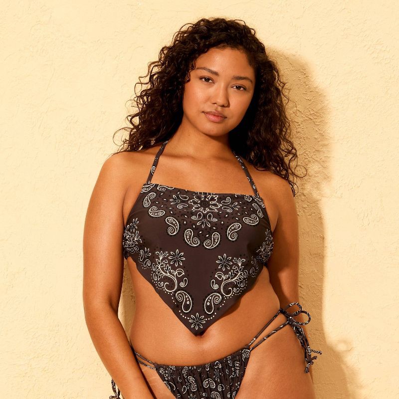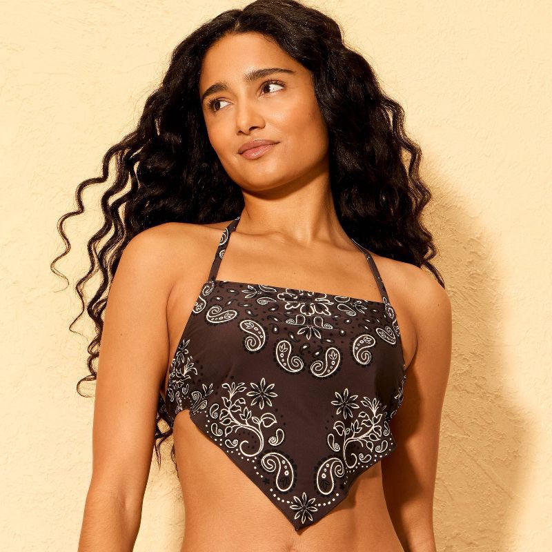 Halter tankini top from Wild Fable™ features a brown bandana print and a handkerchief-style triangular hem. Made from nylon fabric with spandex and 100% recycled polyester partial lining with a four-w…