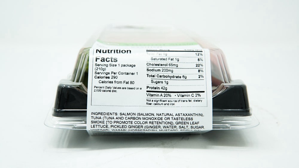 Ingredients: Salmon (Salmon, Natural Astaxanthin), Tuna (Tuna And Carbon Monoxide Or Tasteless Smoke [To Promote Color Retention]), Green Leaf Lettuce, Pickled Ginger (Ginger, Water, Salt, Sugar, Vine…