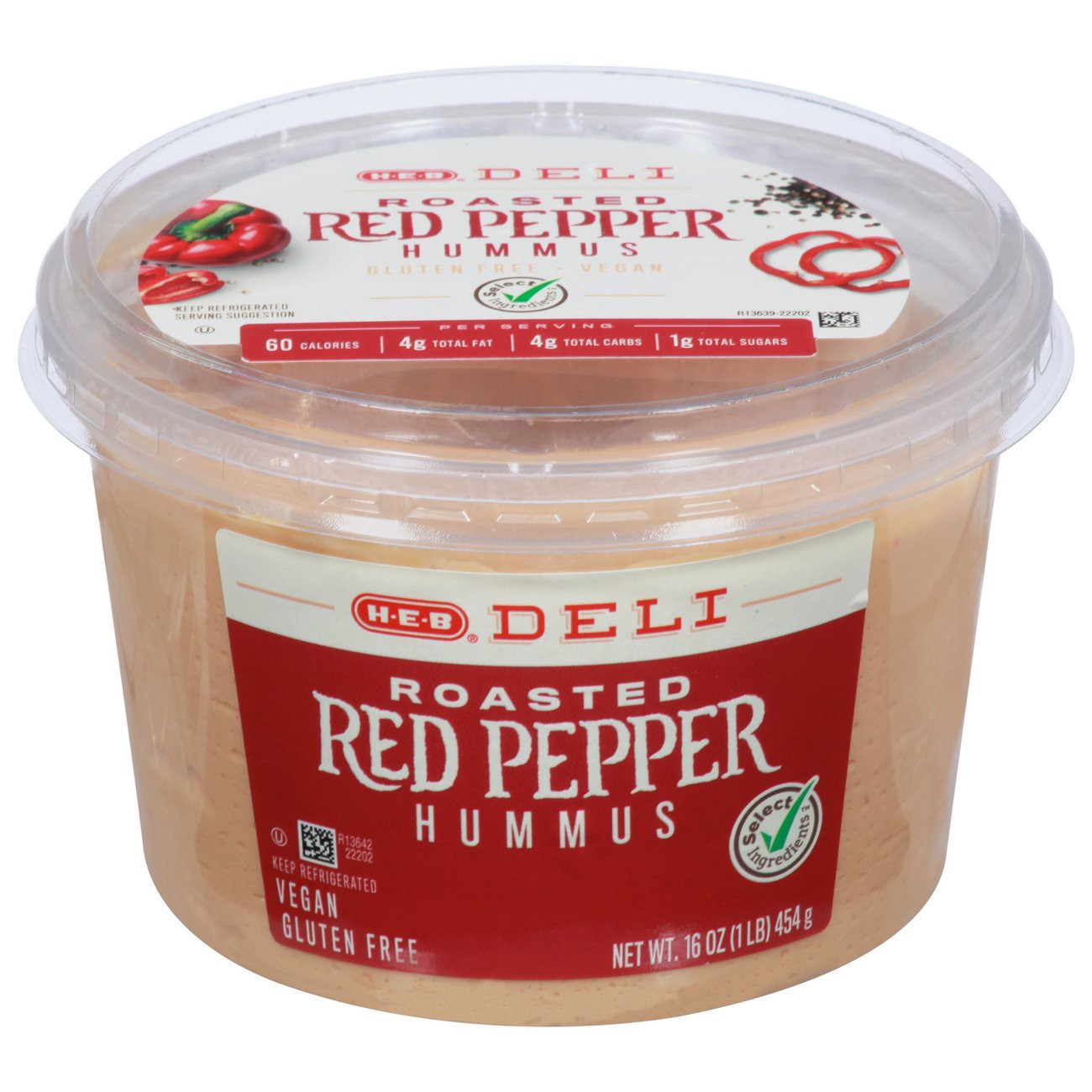 Enjoy this H-E-B Deli Roasted Red Pepper Hummus as a delicious dip or sandwich spread. Steamed chickpeas, olive and sunflower oil, sesame tahini, sea salt and spices combine for a creamy, smooth and d…