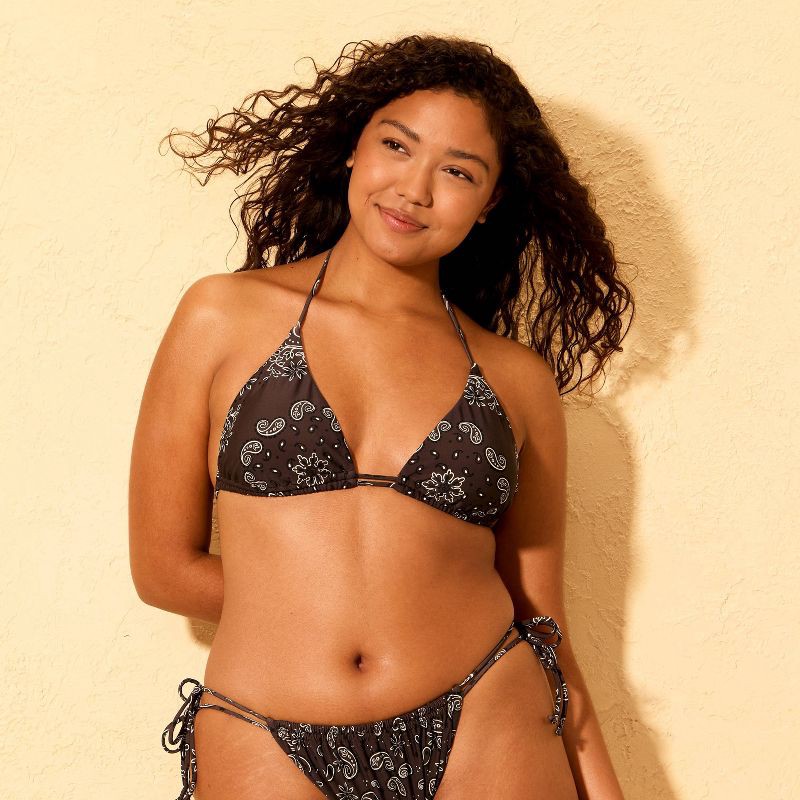 Double-strap triangle bikini top from Wild Fable™ features a brown bandana print and halter neckline. Made from nylon fabric with spandex and 100% recycled polyester full lining with a four-way stretc…