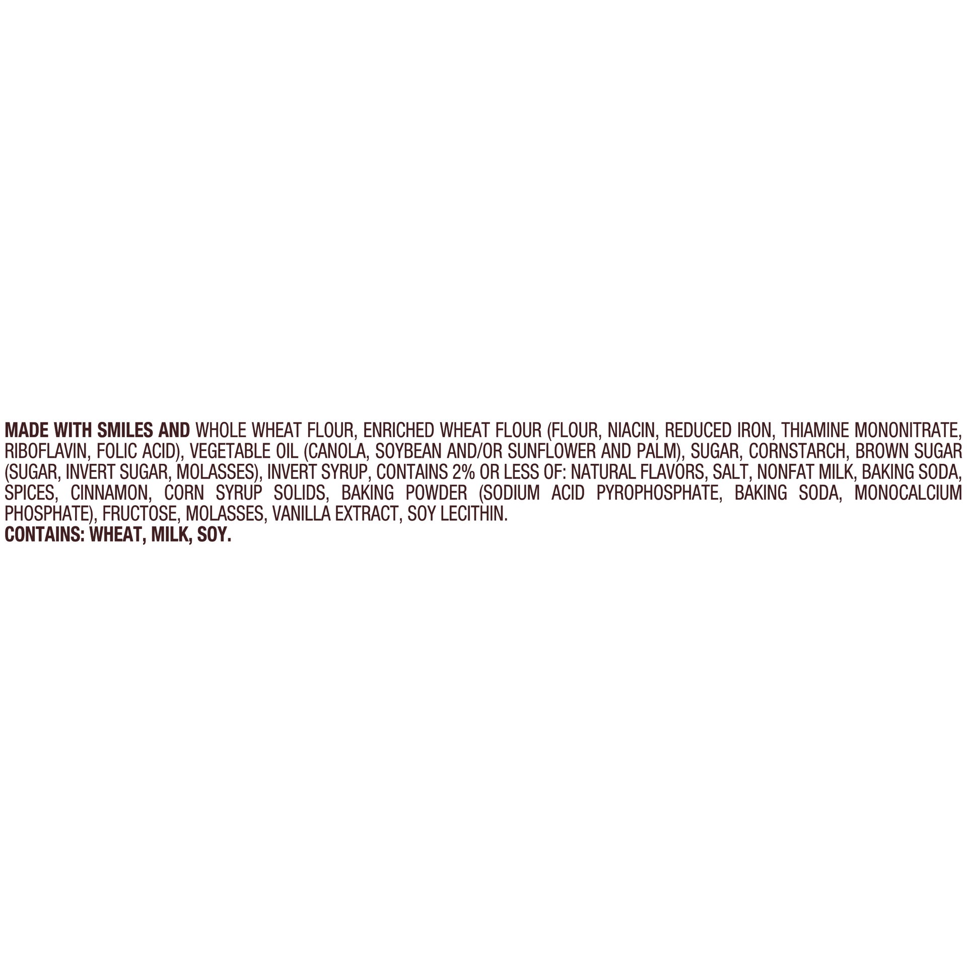 MADE WITH SMILES AND WHOLE WHEAT FLOUR, ENRICHED WHEAT FLOUR (FLOUR, NIACIN, REDUCED IRON, THIAMINE MONONITRATE, RIBOFLAVIN, FOLIC ACID), VEGETABLE OIL (CANOLA, SOYBEAN AND/OR SUNFLOWER AND PALM), SUG…