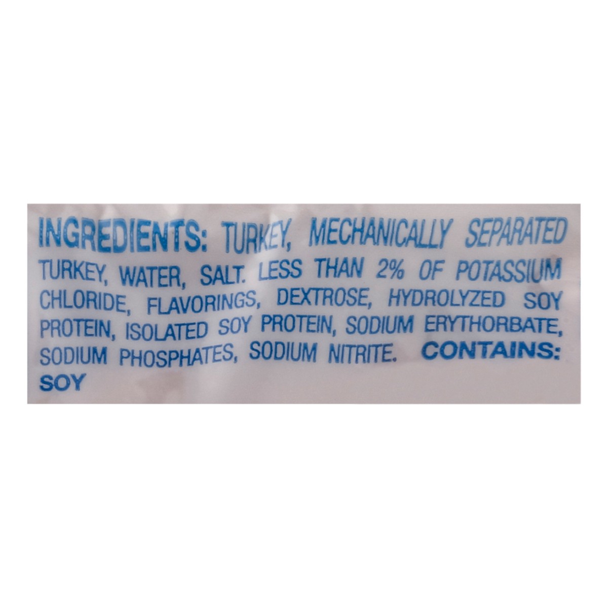 Turkey, Mechanically Separated Turkey, Water, Less than 2% of Isolated Soy Protein, Salt, Flavorings, Potassium Lactate, Dextrose, Hydrolyzed Soy Protein, Sodium Diacetate, Potassium Chloride, Sodium …