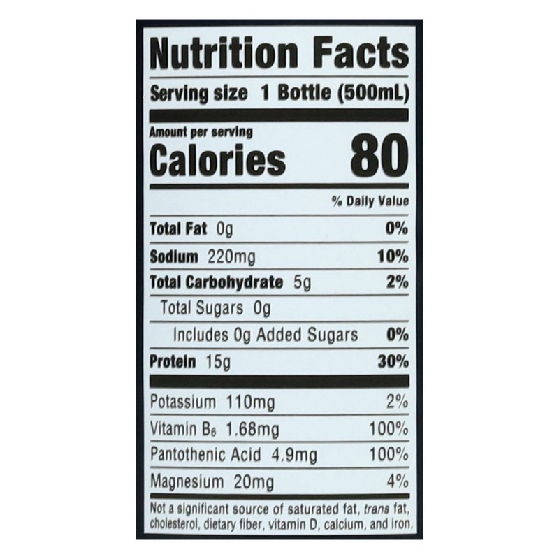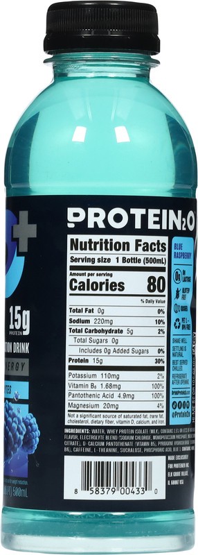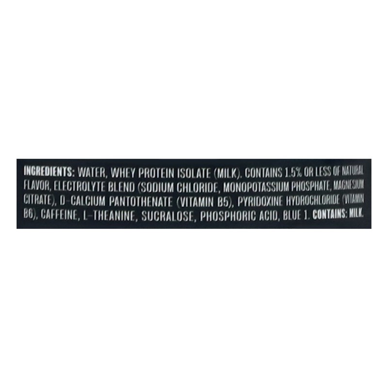Water, Whey Protein Isolate (Milk), Natural Flavors, Caffeine, Sucralose, Blue 1, Phosphoric Acid.