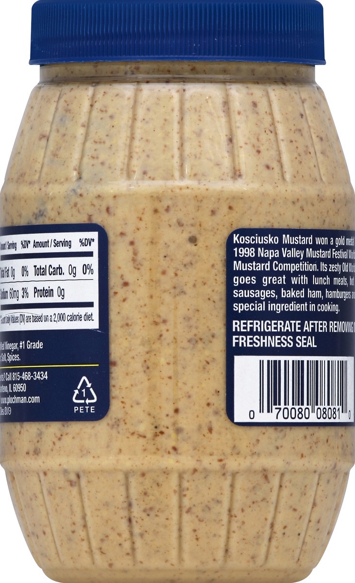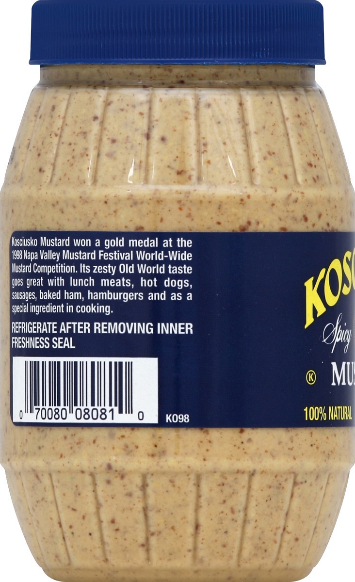 100% natural. Kosciusko Mustard won a gold medal at the 1998 Napa Valley Mustard Festival World-Wide Mustard Competition. Its zesty Old World taste goes great with lunch meats, hot dogs, sausages, bak…