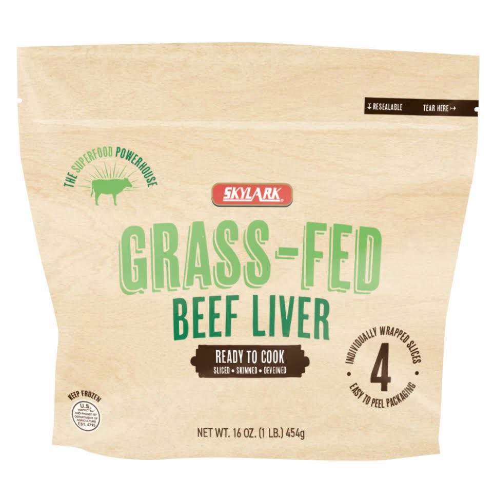 Skylark ready to cook, grass-fed beef liver. Four individually wrapped slices in easy to peel packaging.