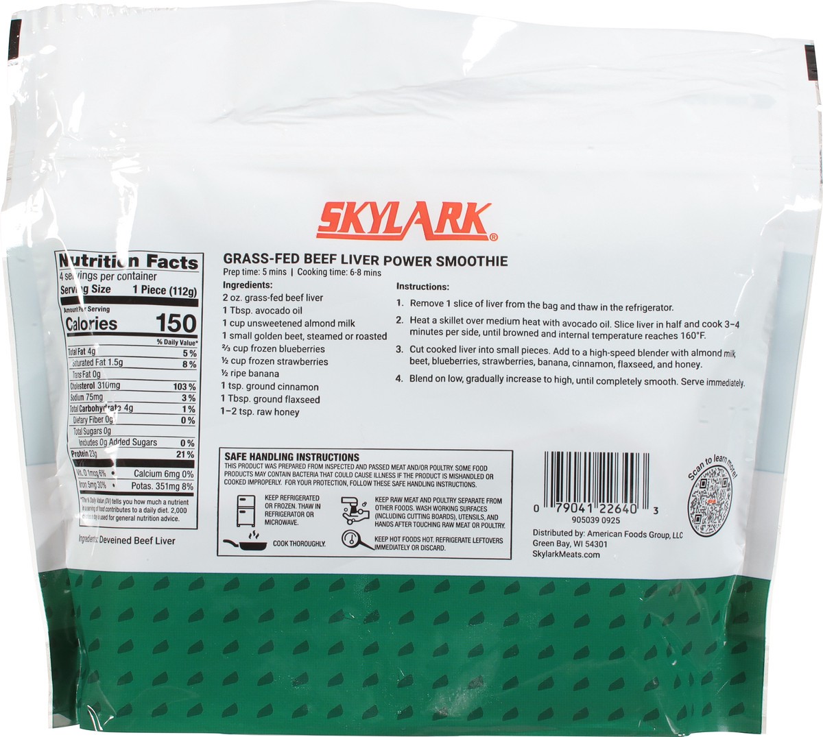 The Goodness of Liver: 4 grams fat; 150 calories; 23 grams protein; 380% vitamin A. 4 individually wrapped slices. Grass-fed. The super food powerhouse. Sliced. Skinned. Deveined. Ready to cook. Beef …