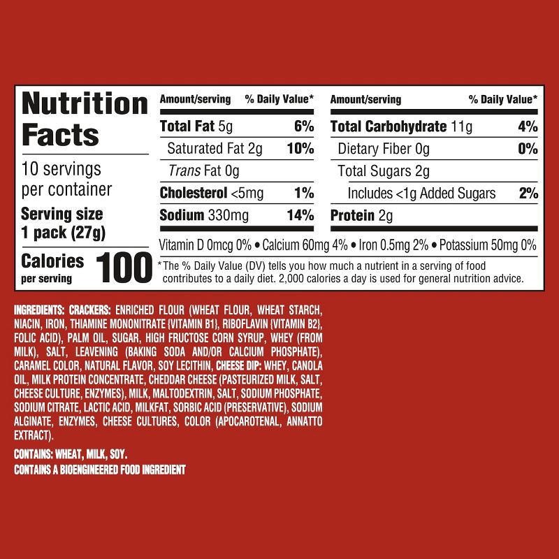 - Individually packaged salted crackers paired with a cheesy dip made with real cheese