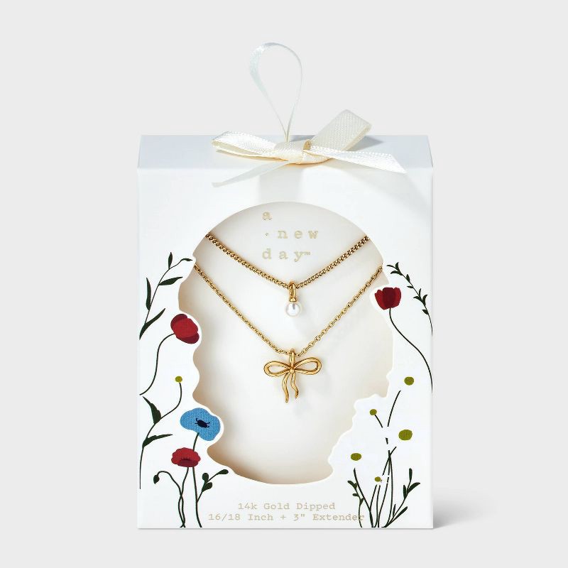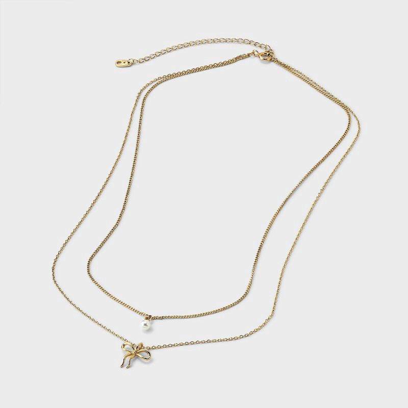 Make a graceful statement with this 14k Gold-Dipped Pearl & Bow Multi-Strand Necklace from A New Day™. Crafted from nickel-free metal, this gold-tone necklace features two chains — an inner curb chain…