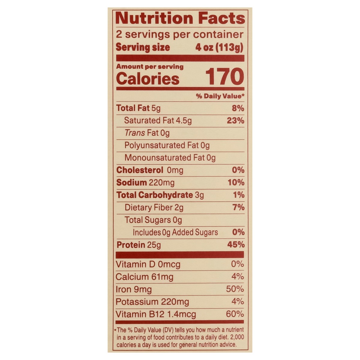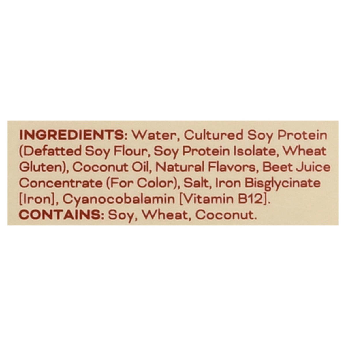 Water, Cultured Soy Protein (Defatted Soy Flour, Soy Protein Isolate, Wheat Gluten), Coconut Oil, Natural Flavors, Beet Juice Concentrate (for Color), Salt, Iron Bisglycinate [Iron], Cyanocobalamin [V…