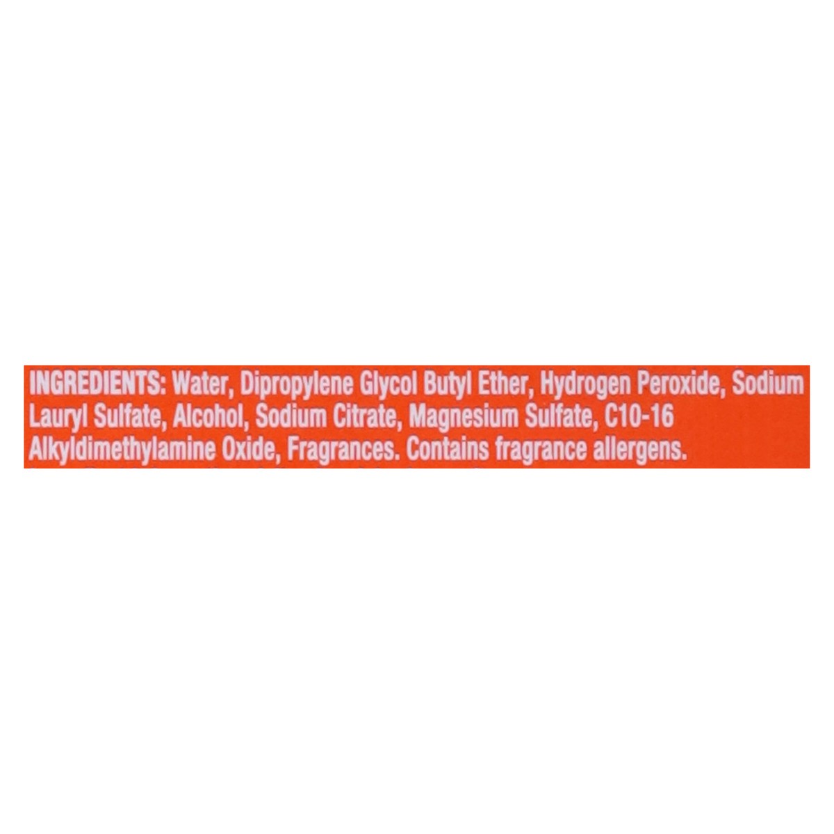 Water, Dipropylene Glycol Butyl Ether, Hydrogen Peroxide, Sodium Lauryl Sulfate, Alcohol, Sodium Citrate, Magnesium Sulfate, C10-16 Alkyldimethylamine Oxide, Fragrances.