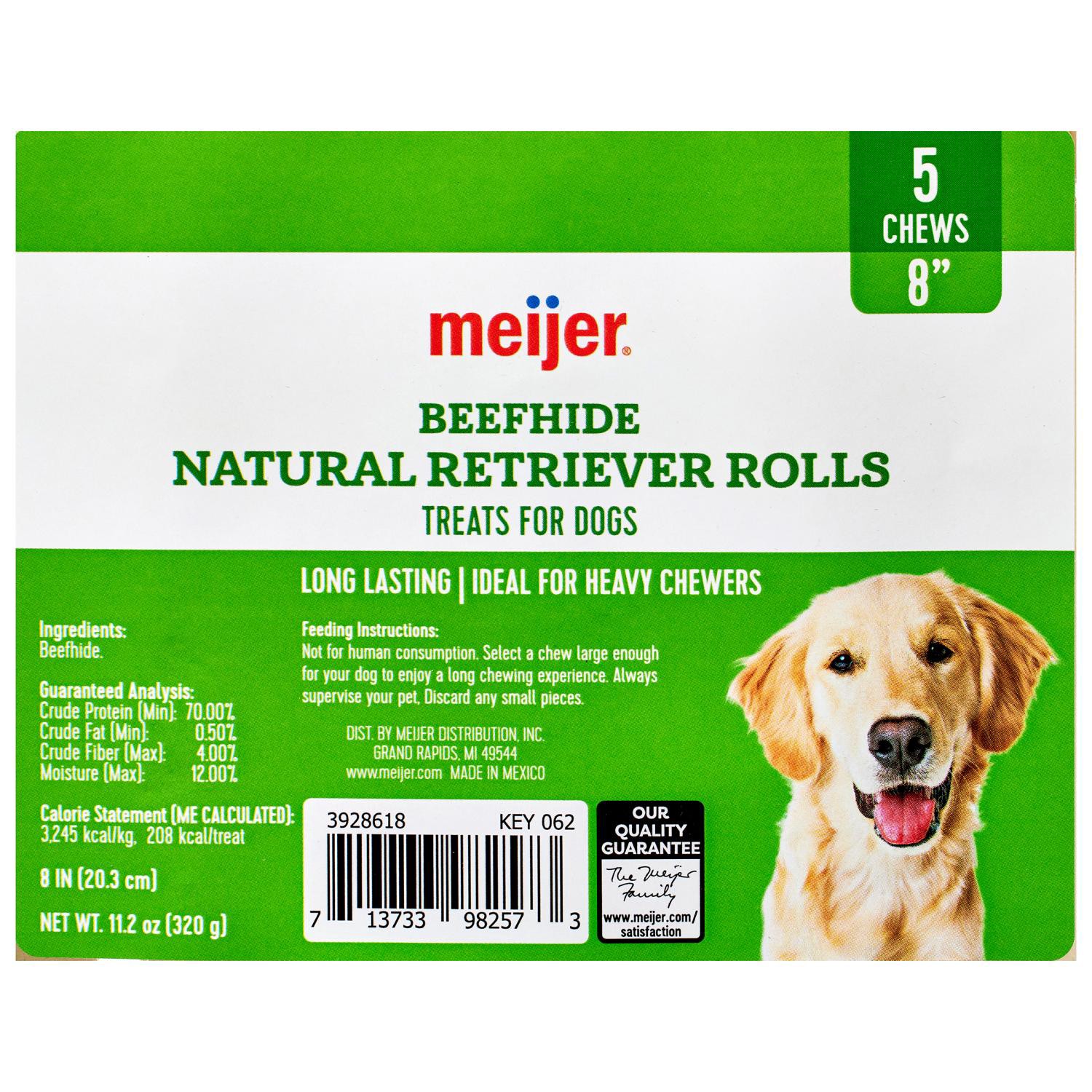 Show your pup you care with the drool-worthy Meijer Beefhide Retriever Rolls. Perfect for medium and large dogs over 20 pounds, these 8 inch bones are sure to keep your furry friend busy and their tai…