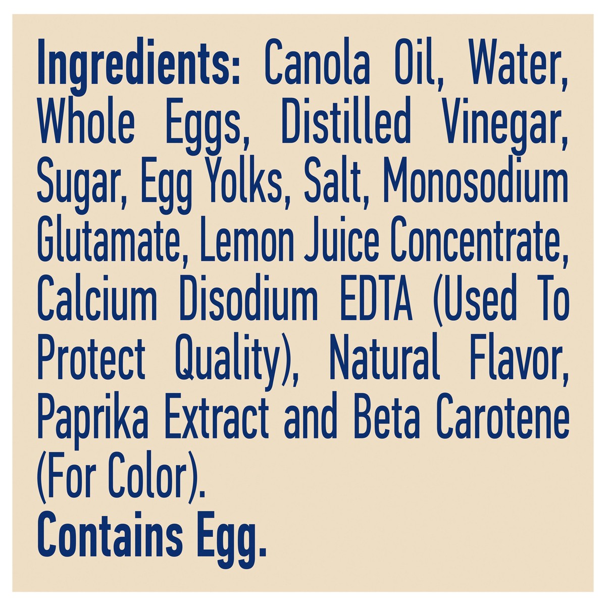 Ingredients: Canola Oil, Water, Whole Eggs, Distilled Vinegar, Sugar, Egg Yolks, Salt, Monosodium Glutamate, Lemon Juice Concentrate, Calcium Disodium EDTA (Used To Protect Quality), Natural Falvor, P…