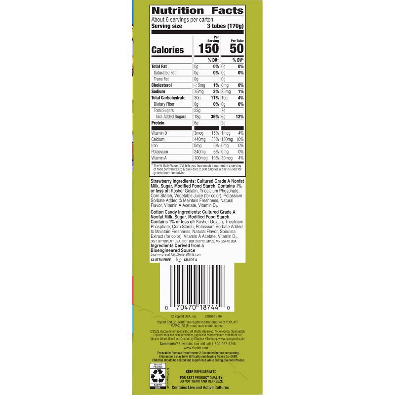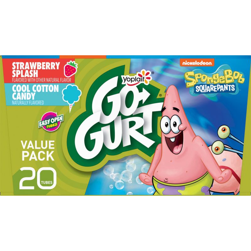 - CONTAINS: One 40 oz Variety Pack of Yoplait Go-GURT SpongeBob SquarePants Strawberry Splash Flavored and Cool Cotton Candy Flavored Fat Free Yogurt; Twenty 2 oz yogurt tubes total