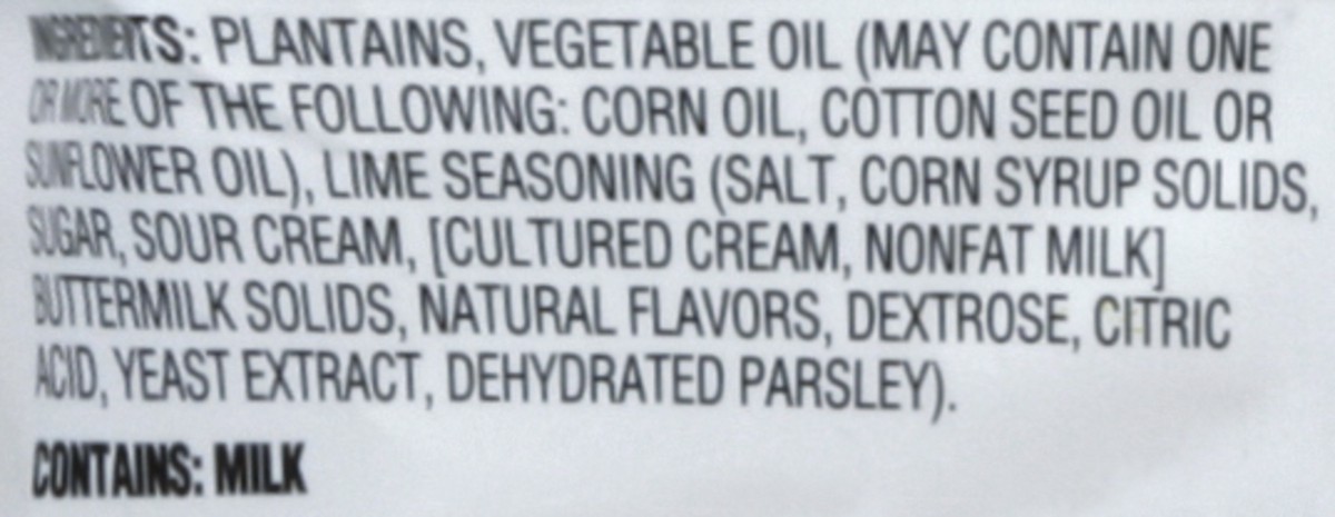 Plantains, Vegetable Oil (May Contain One or More of the Following: Corn Oil, Cotton Seed Oil or Sunflower Oil), Lime Seasoning (Salt, Corn Syrup Solids, Sugar, Sour Cream, [Cultured Cream, Nonfat Mil…