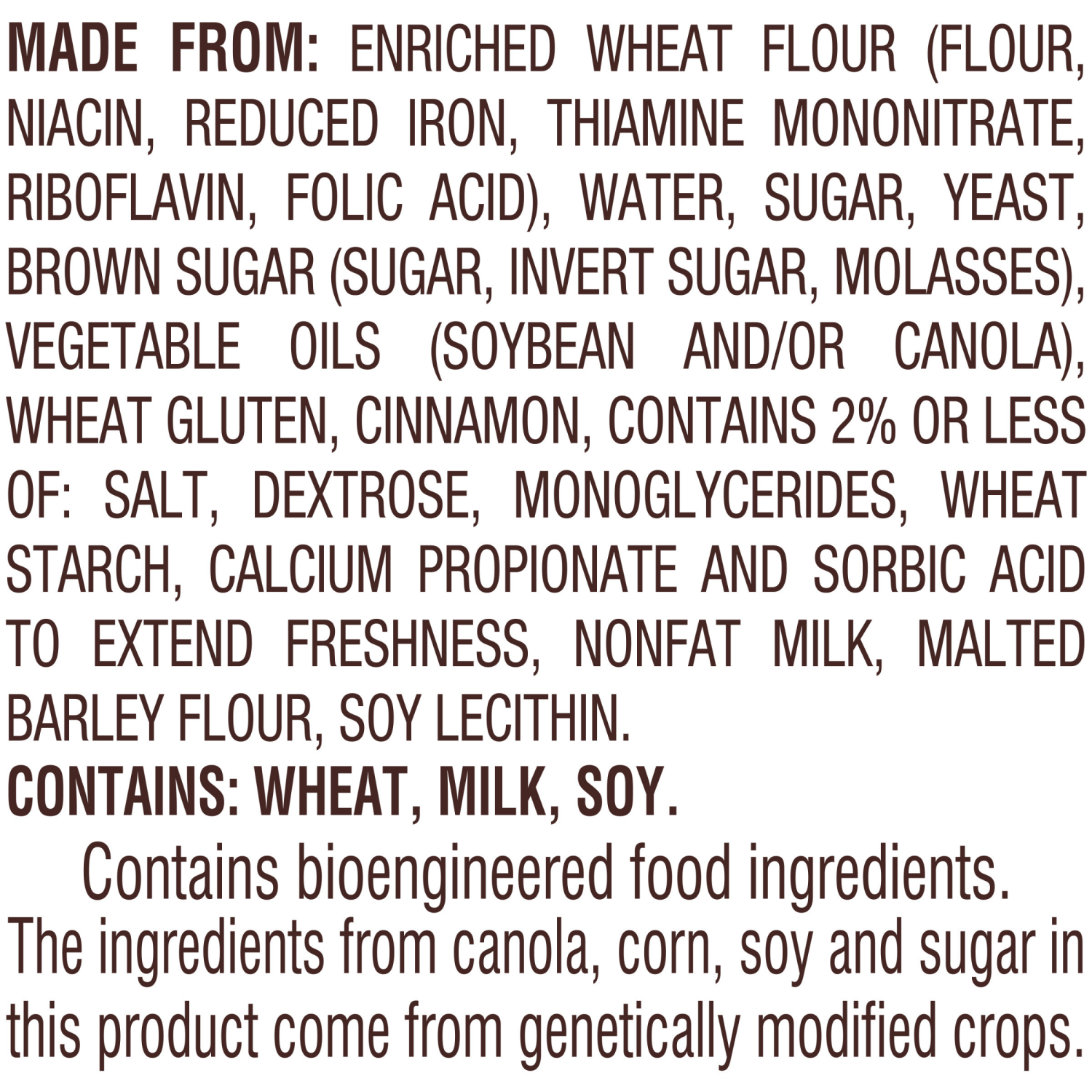 MADE FROM: ENRICHED WHEAT FLOUR (FLOUR, NIACIN, REDUCED IRON, THIAMINE MONONITRATE, RIBOFLAVIN, FOLIC ACID), WATER, SUGAR, YEAST, BROWN SUGAR (SUGAR, INVERT SUGAR, MOLASSES), VEGETABLE OILS (SOYBEAN A…