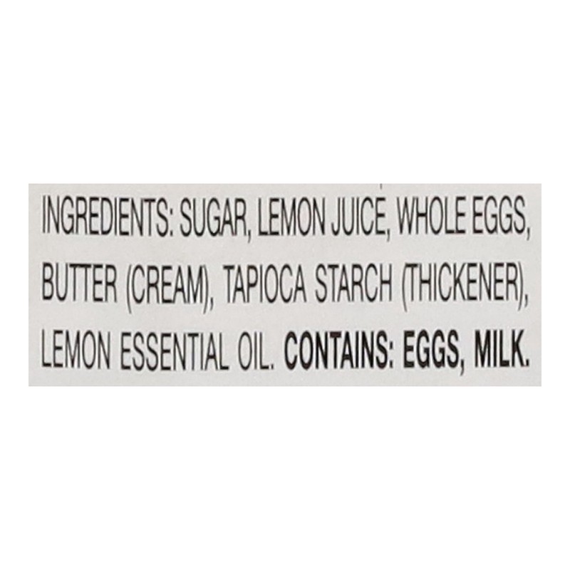 Sugar, Lemon Juice, Whole Eggs, Butter (Cream), Tapioca Starch (Thickener), Lemon Essential Oil.