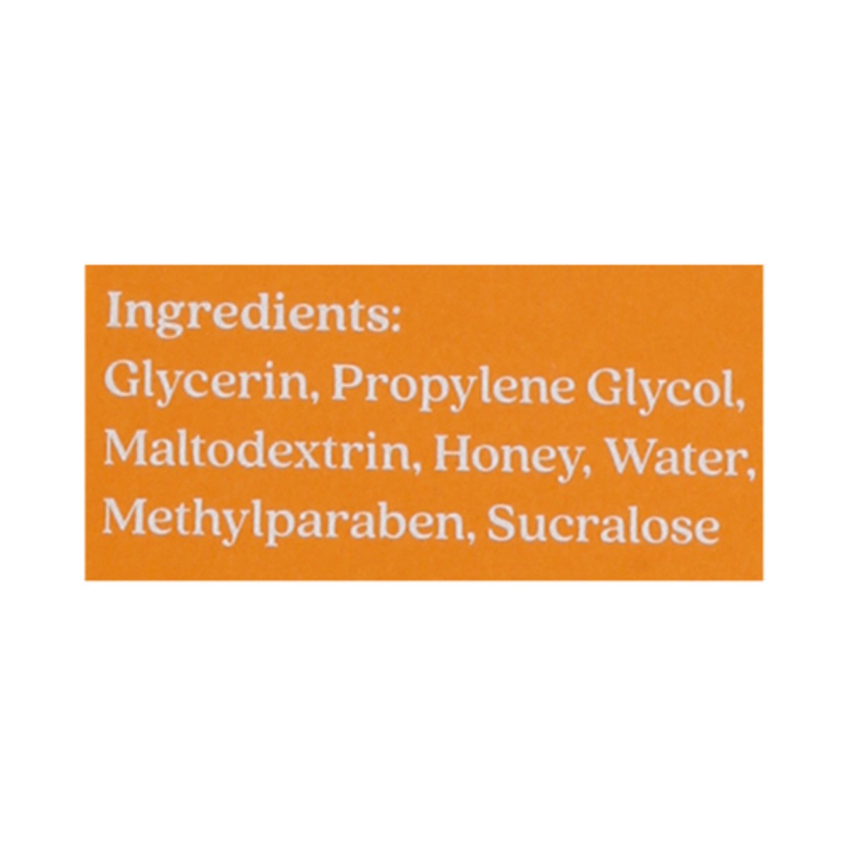 Glycerin, Propylene Glycol, Maltodextrin, Honey, Water, Methylparaben, Sucralose.