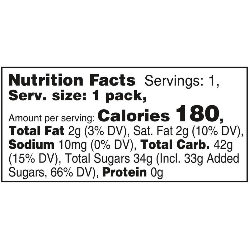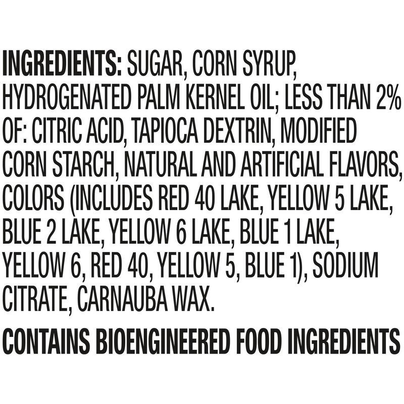 SUGAR, CORN SYRUP, HYDROGENATED PALM KERNEL OIL; LESS THAN 2% OF: CITRIC ACID, TAPIOCA DEXTRIN, MODIFIED CORNSTARCH, NATURAL AND ARTIFICIAL FLAVORS, COLORS (INCLUDES RED 40 LAKE, YELLOW 5 LAKE, BLUE 2…